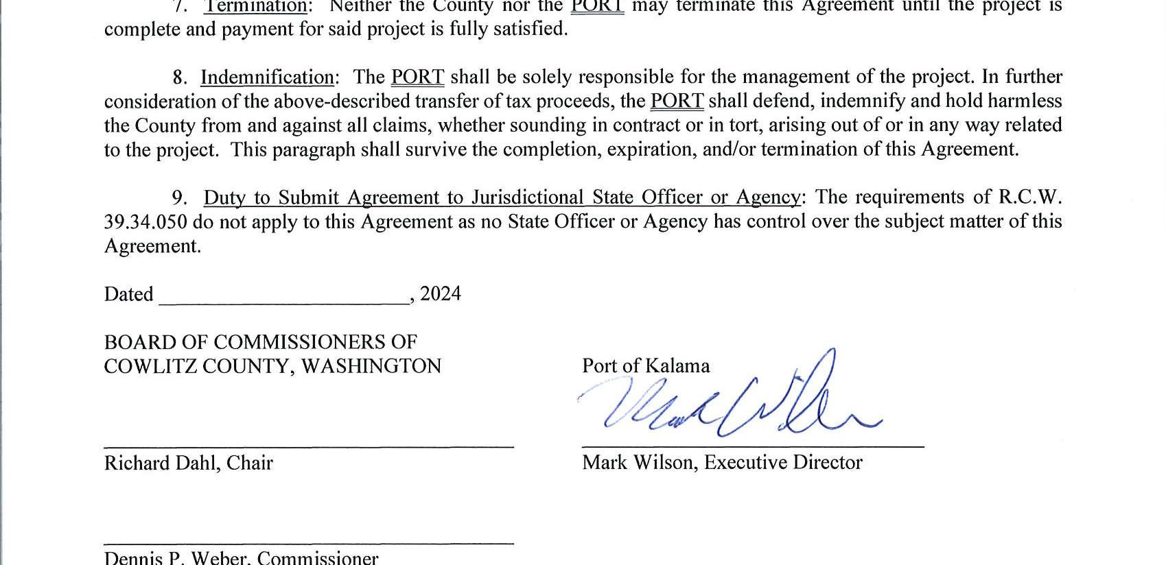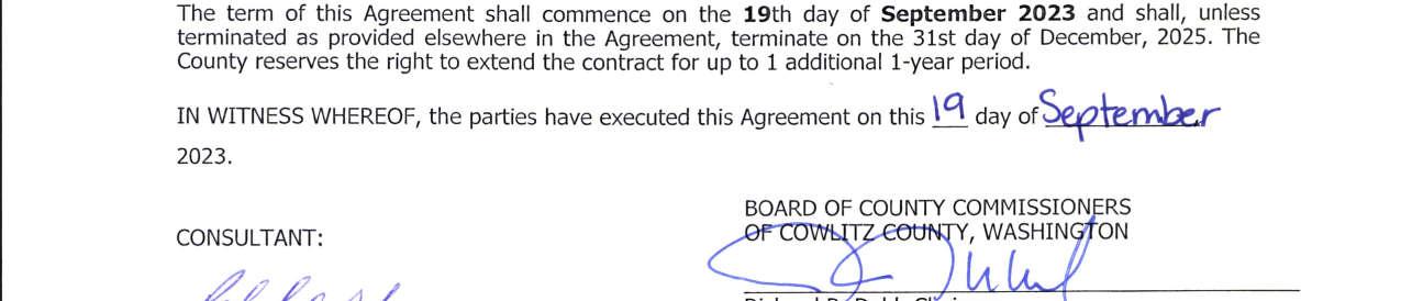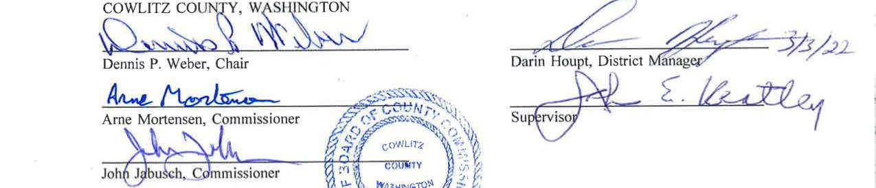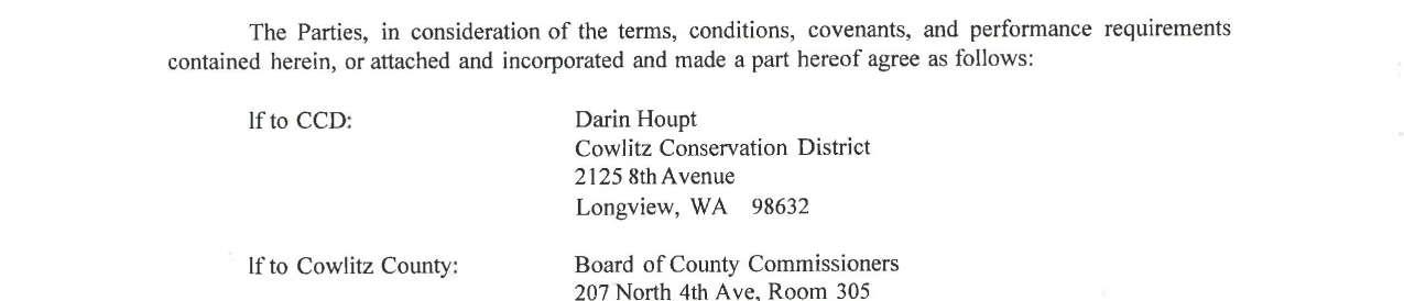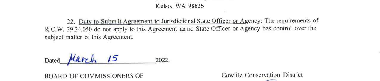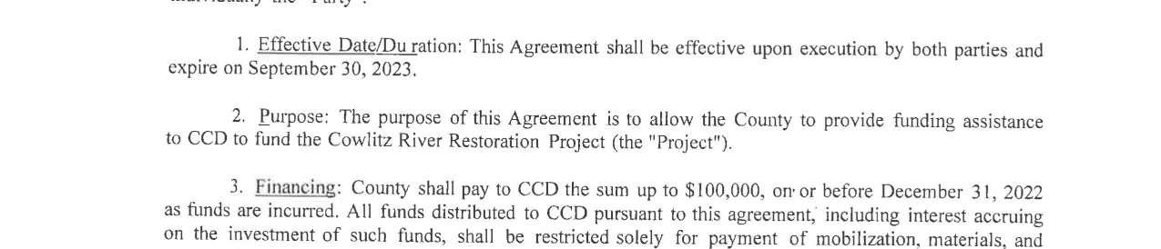 4.Contract Amendment No. 1 with 2022 Cowlitz Conservation District for services of the Cowlitz River Restoration Project. The amendment extends the contract until September 30, 2024, and not to exceed $100,000.