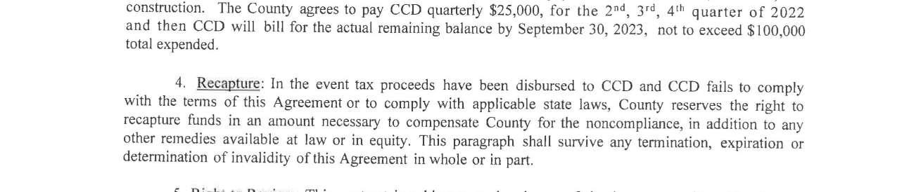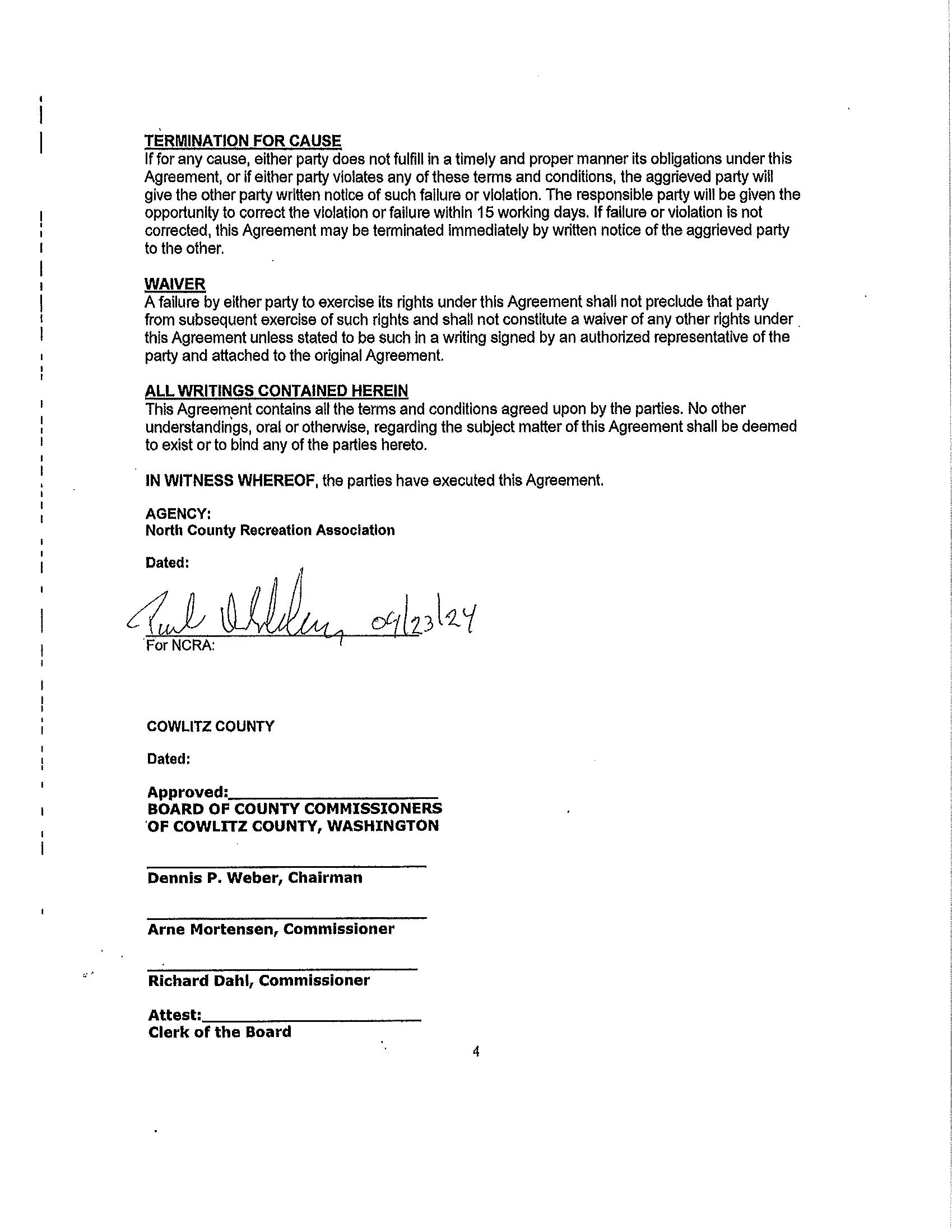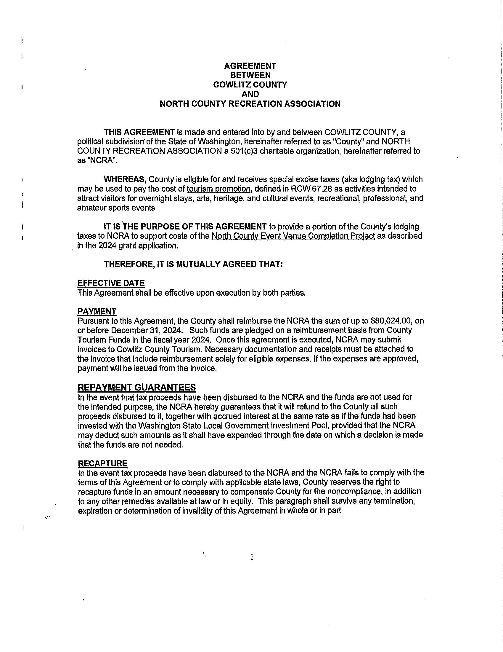 2.Agreement with North County Recreation Association to support projects for the North County Event Venue Completion Project. The total cost is $80,024 through the lodging tax fund.