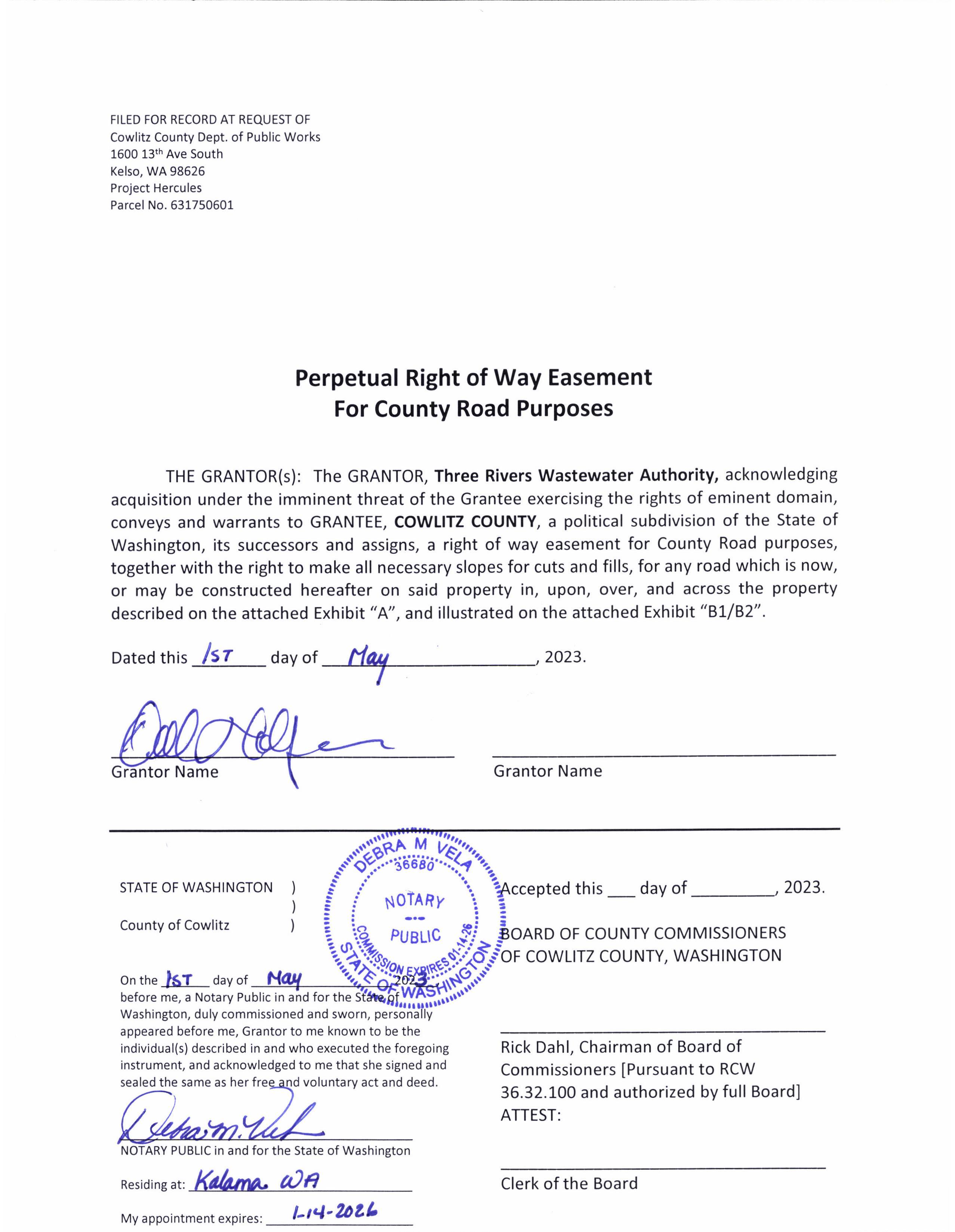 On this _____ day of ___________, 20__, before me personally appeared ____________________________ to me known to be the _________________________, of COWLITZ COUNTY, the county that executed the within and foregoing instrument, and acknowledged said instrument to be the free and voluntary act and deed of said county, for the uses and purposes therein mentioned, and on oath stated that s/he is authorized to execute said instrument.