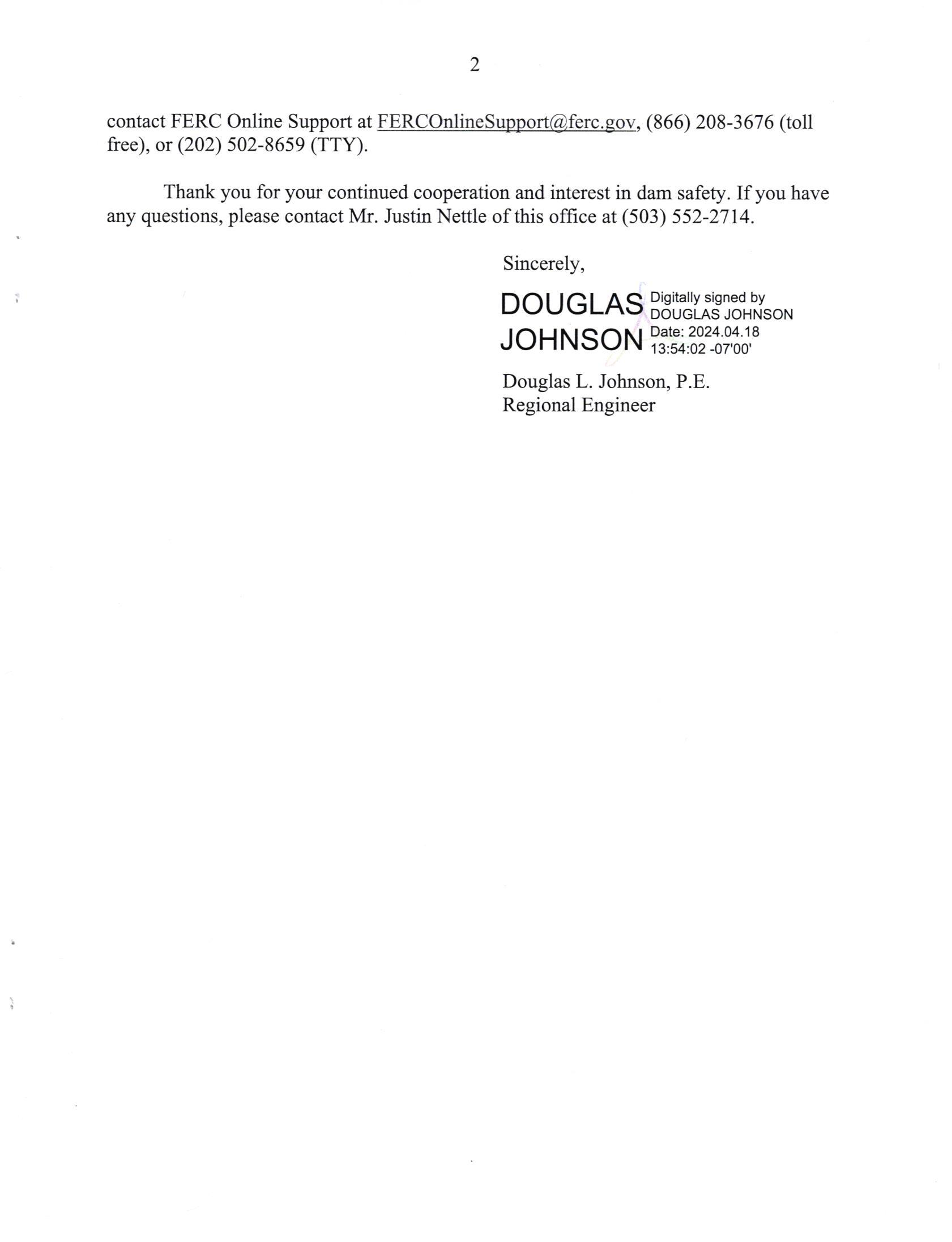Thank you for your continued cooperation and interest in dam safety. Ifyou have any questions, please contact Mr. Justin Nettie of this office at (503) 552-2714.