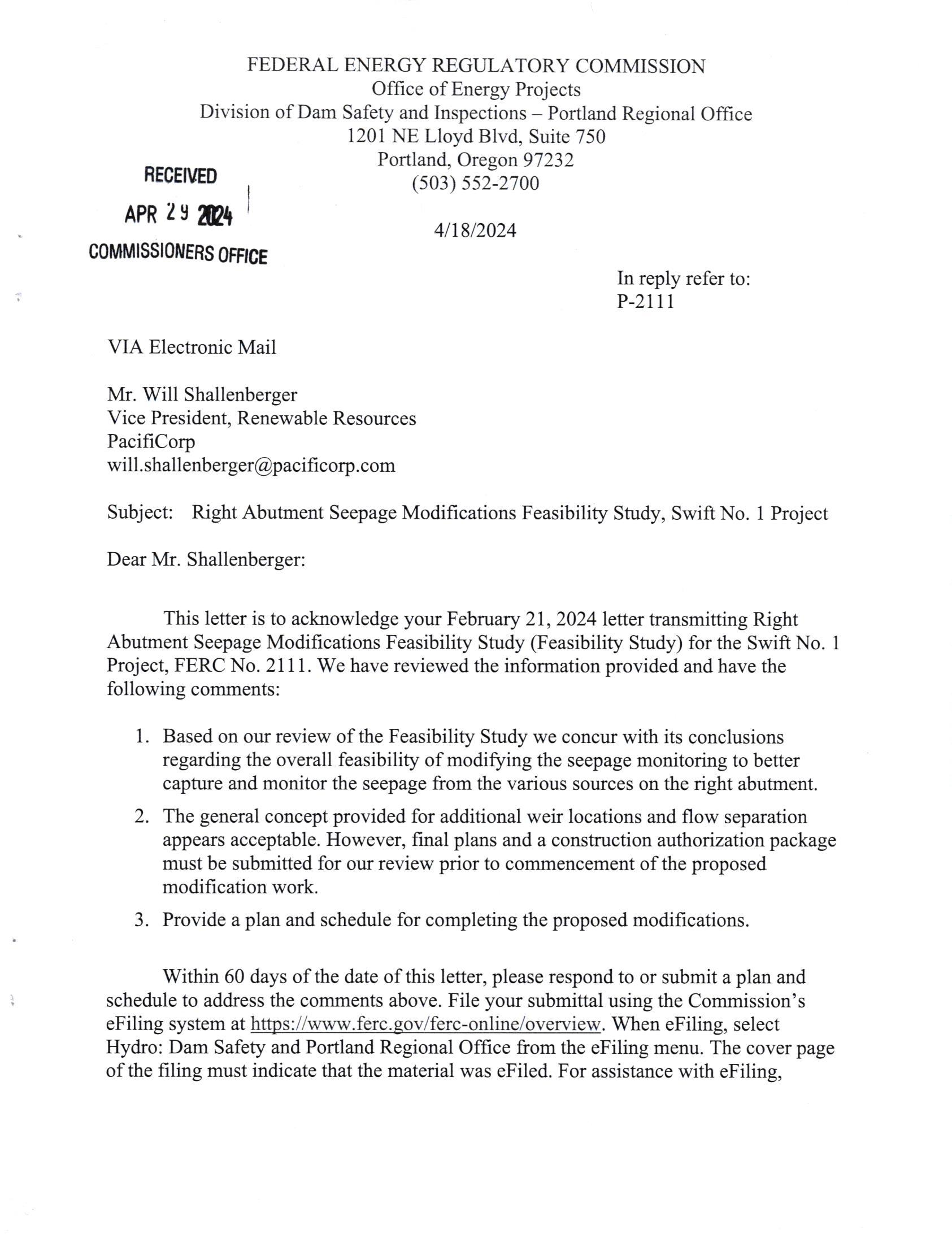 This letter is to acknowledge your February 21, 2024 letter transmitting Right Abutment Seepage Modifications Feasibility Study (Feasibility Study) for the Swift No. 1 Project, FERC No. 21 1 1 We have reviewed the information provided and have the following comments:
