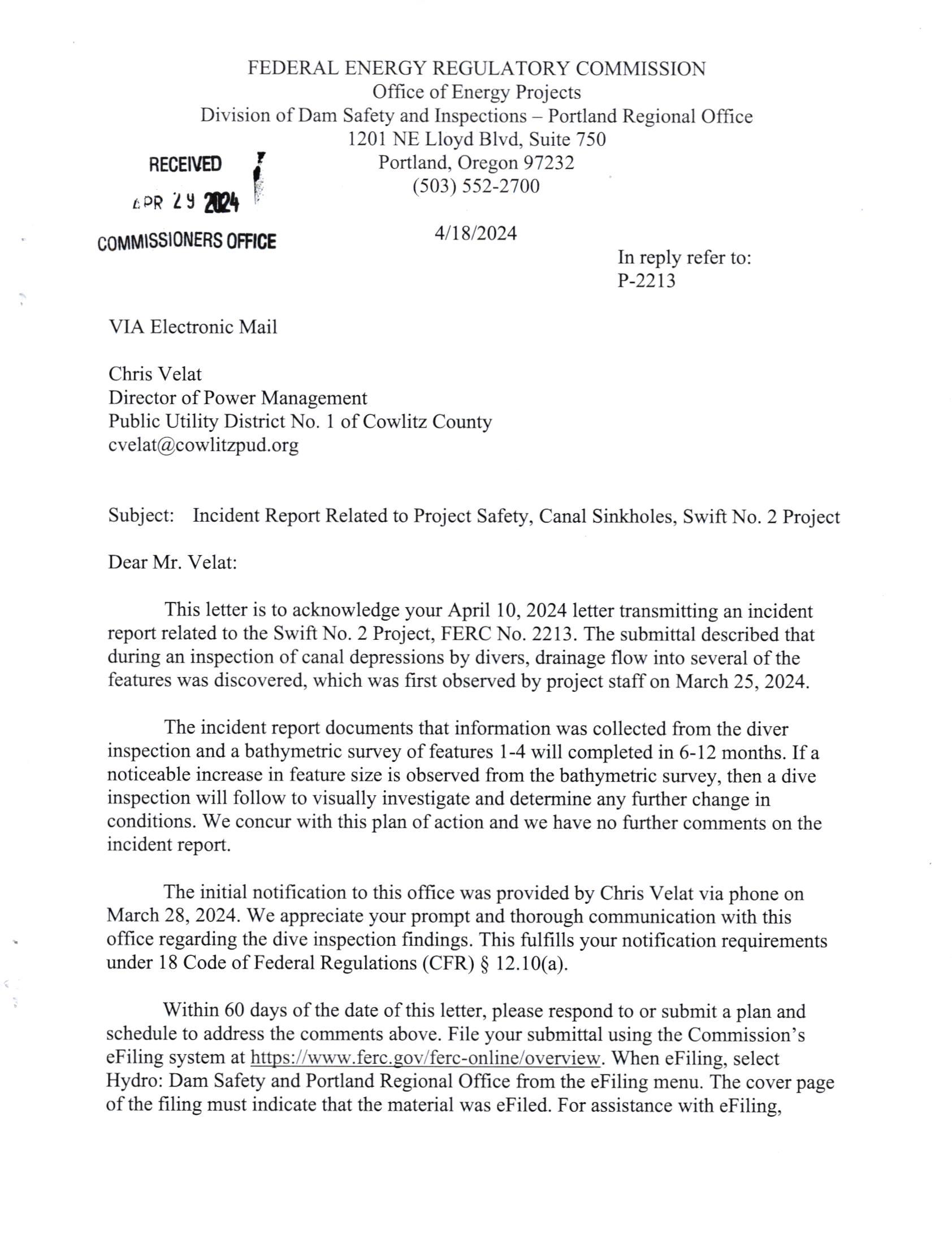 This letter is to acknowledge your April 10,2024 letter transmitting an incident report related to the Swift No. 2 Project, FERC No. 2213. The submittal described that during an inspection ofcanal depressions by divers, drainage flow into several of the features was discovered, which was first observed by project staff on March 25,2024.