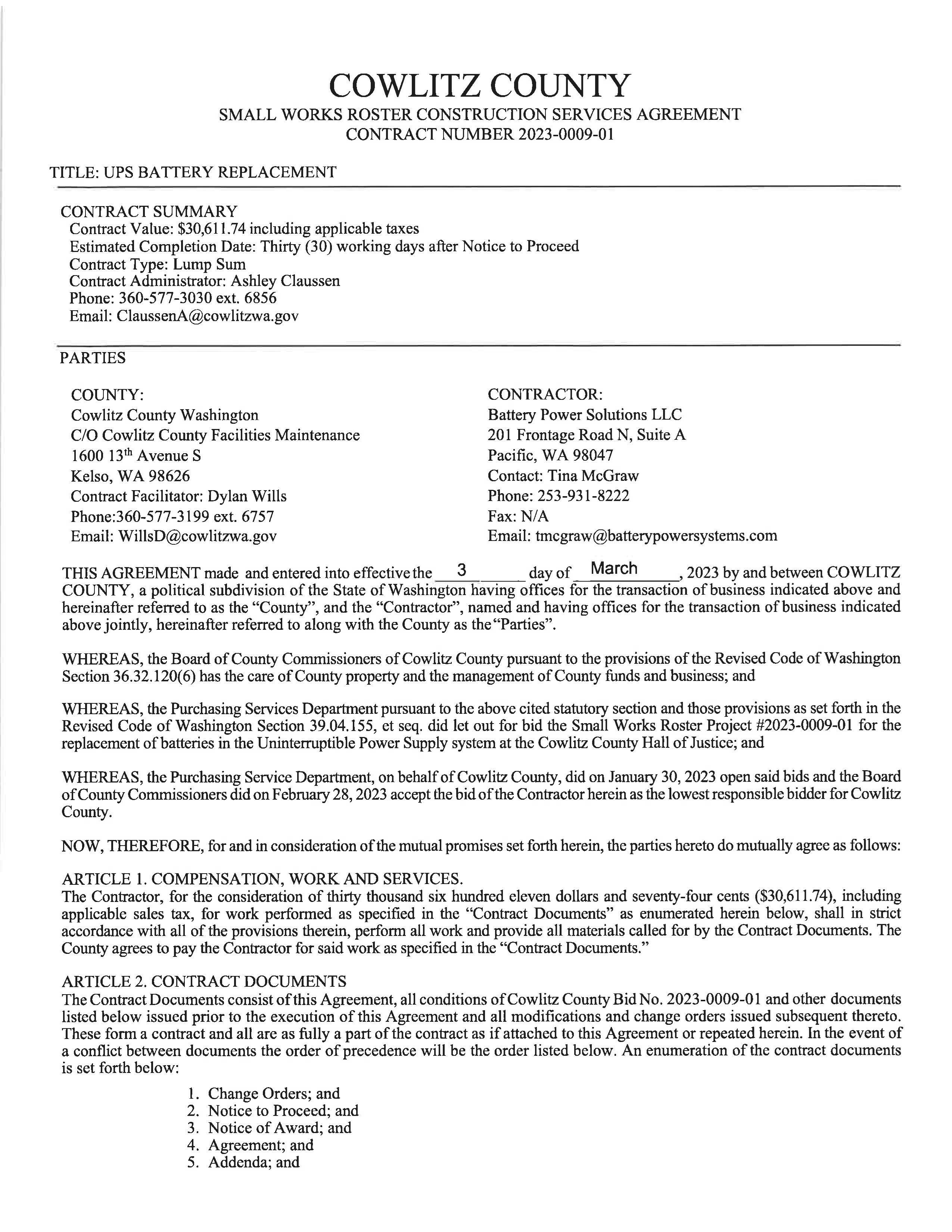 4. Completion Letter to Battery Power Solutions LLC for the UPS Battery Replacement, Project No. 2023-0009-01, at the Hall of Justice. Total cost is $30,611.74 including Washington State tax.