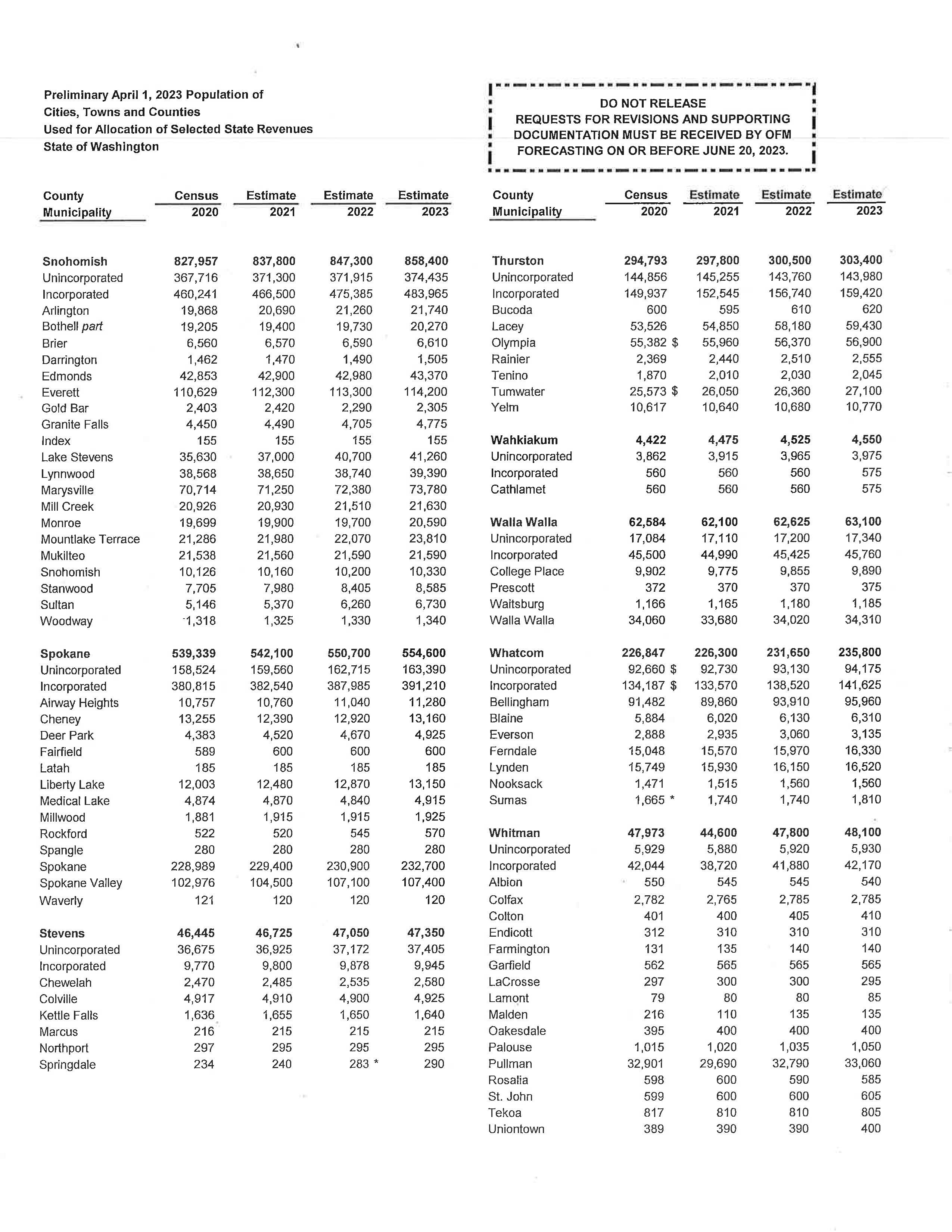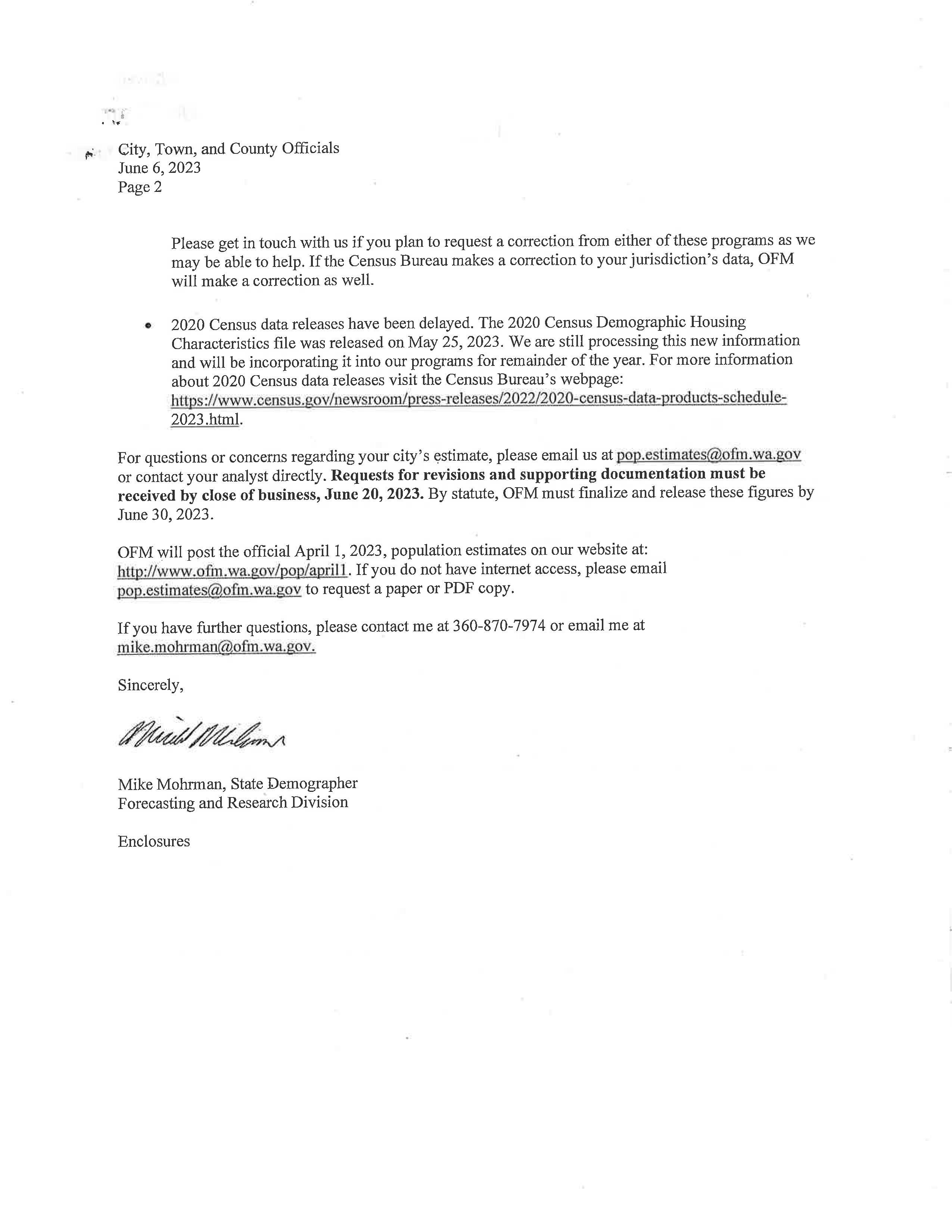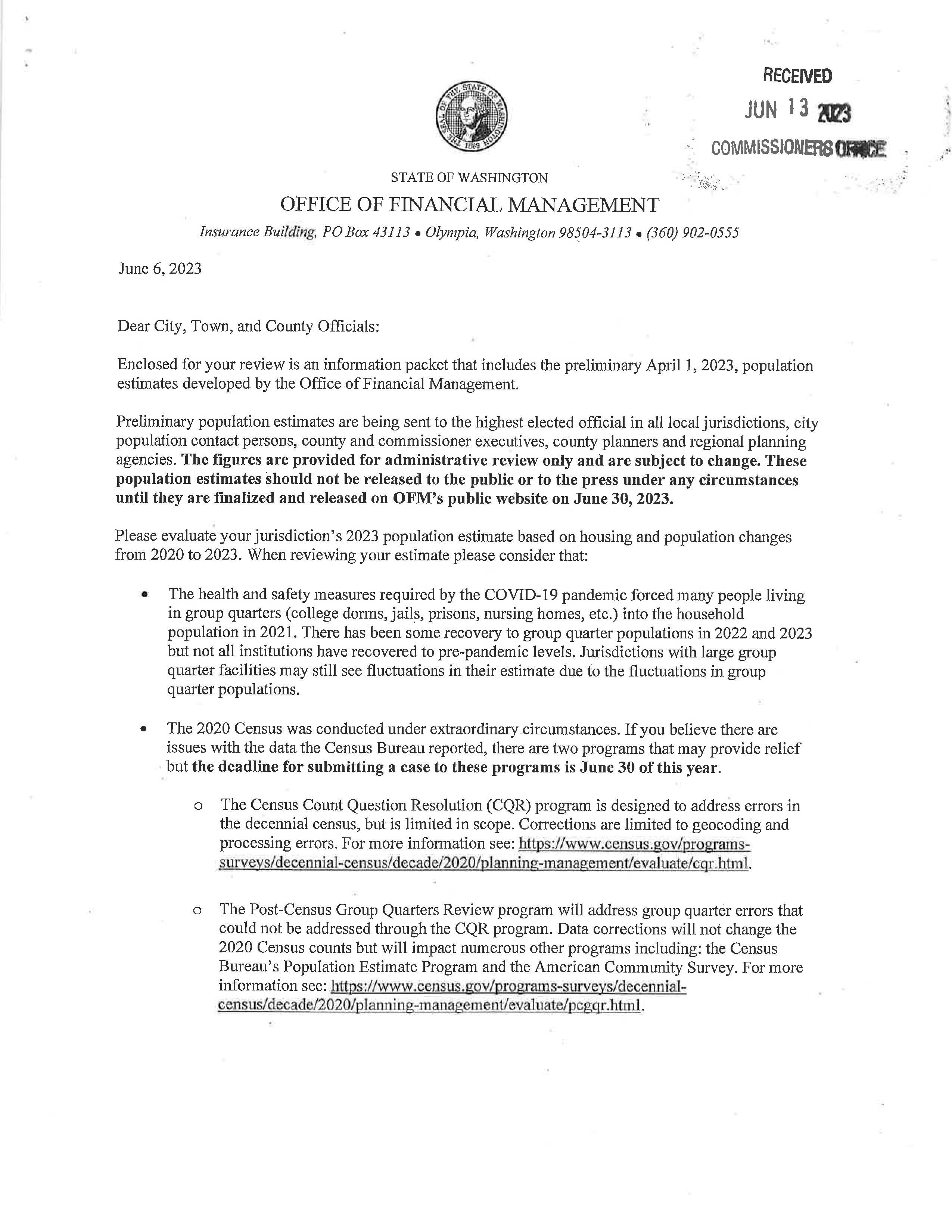 a. Letter dated 6/6/2023 from the State of WA Office of Financial Management to review the preliminary population estimates.