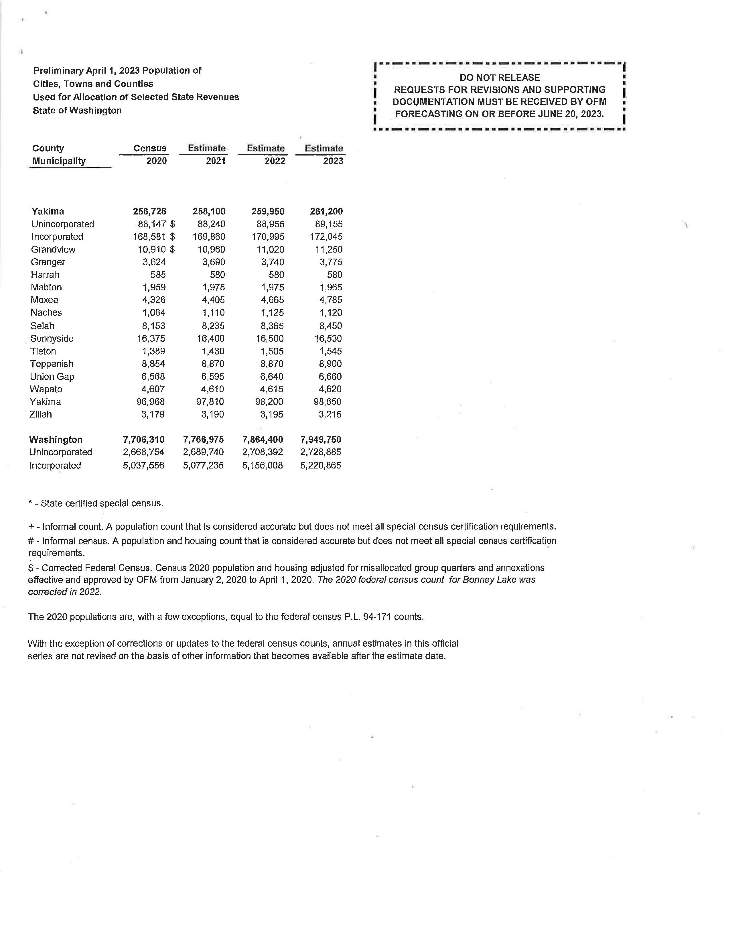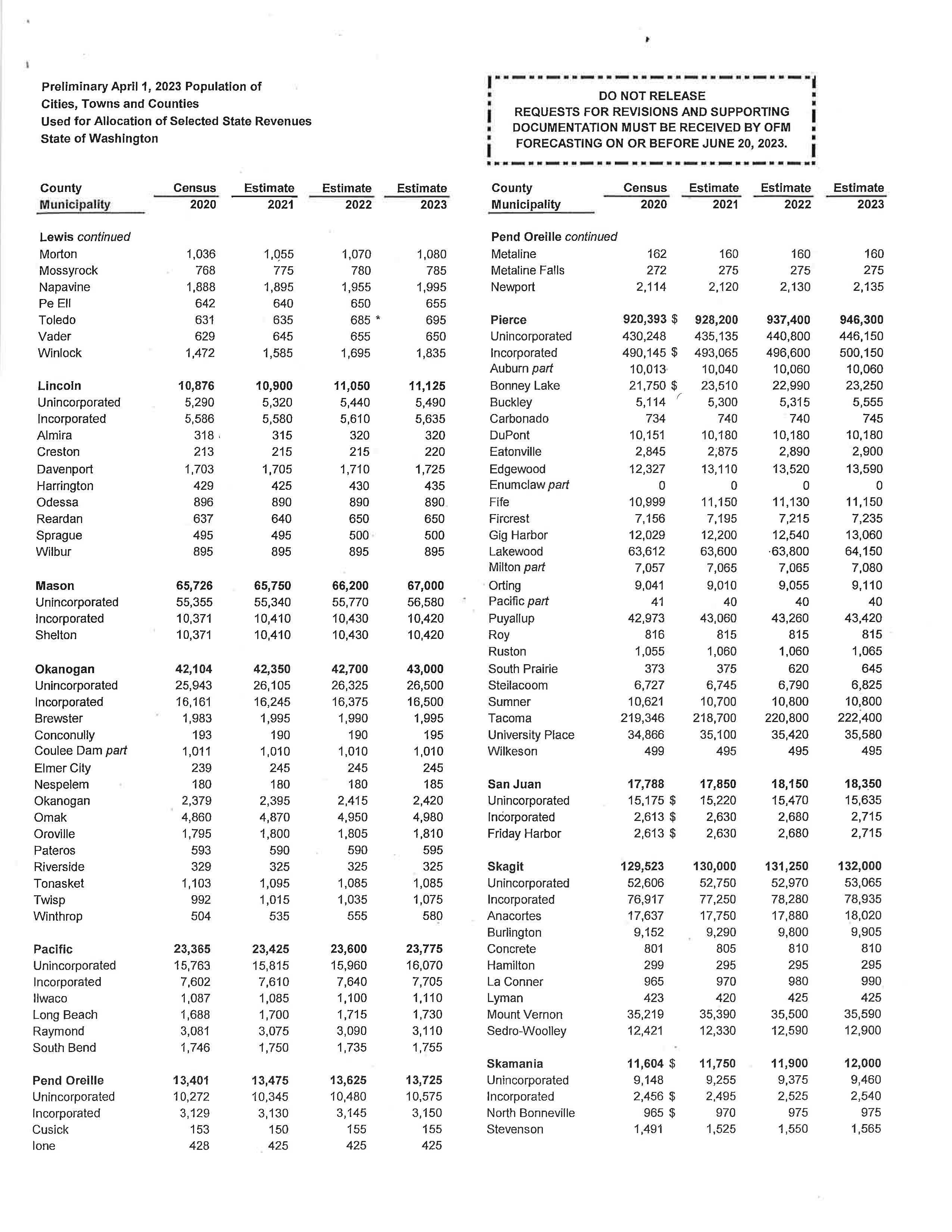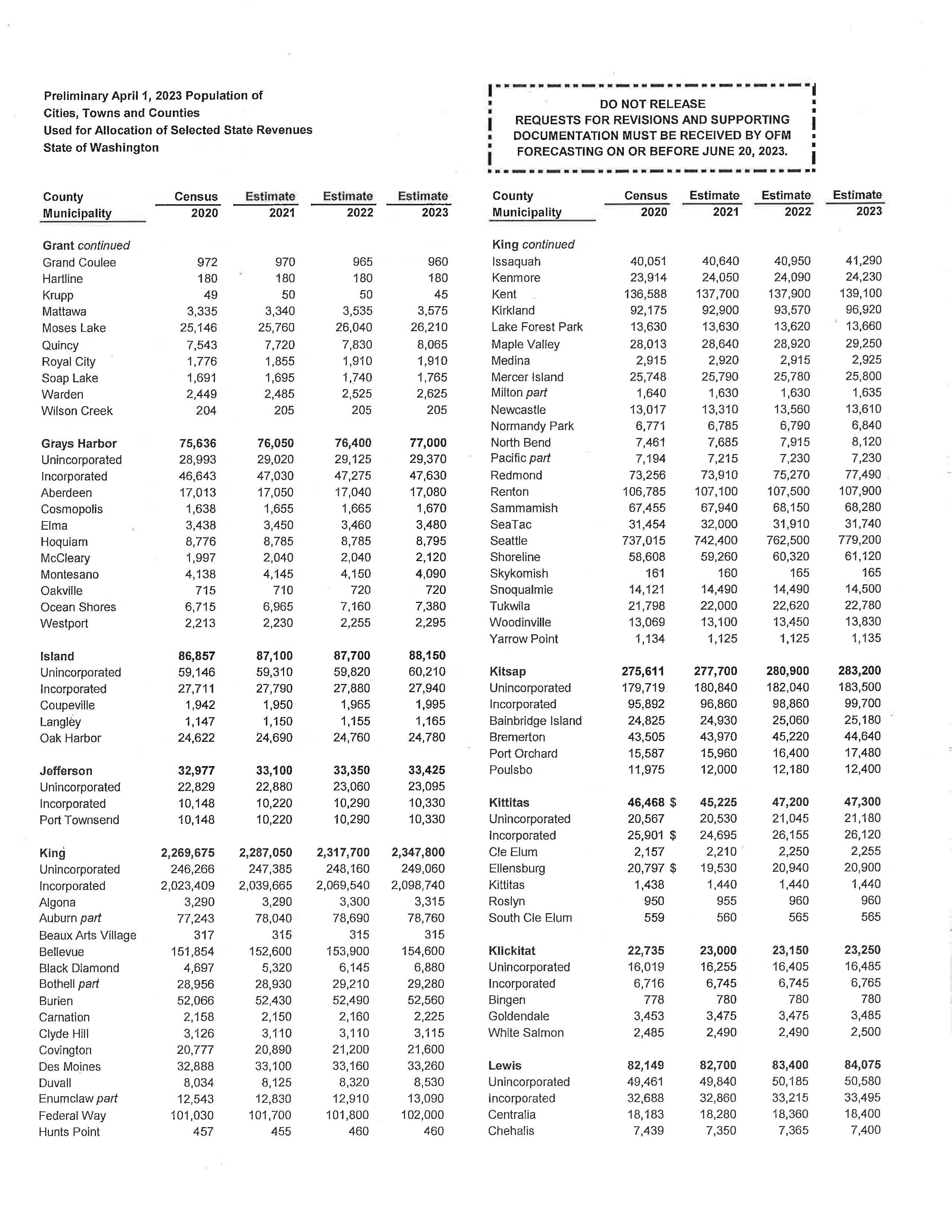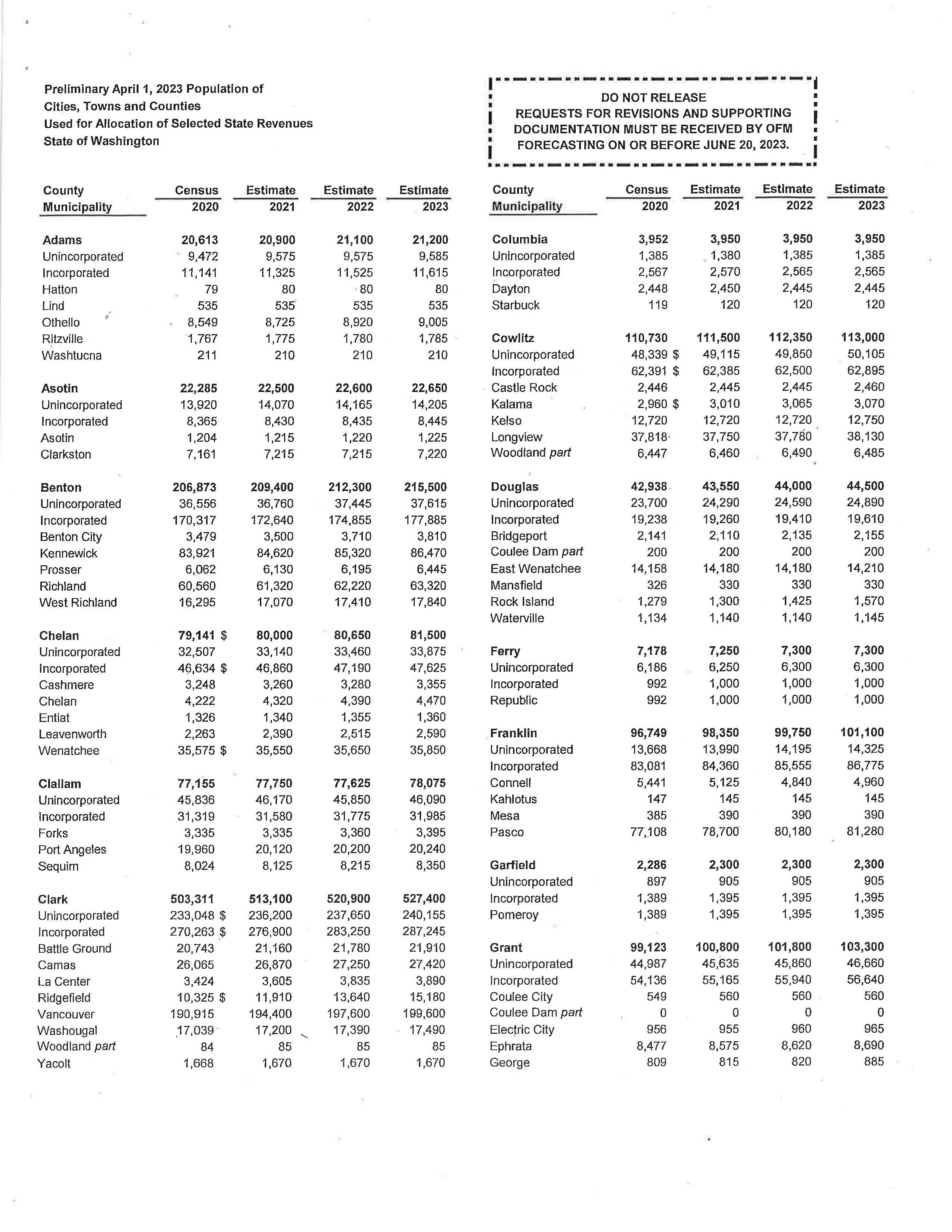 a. Letter dated 6/6/2023 from the State of WA Office of Financial Management to review the preliminary population estimates.