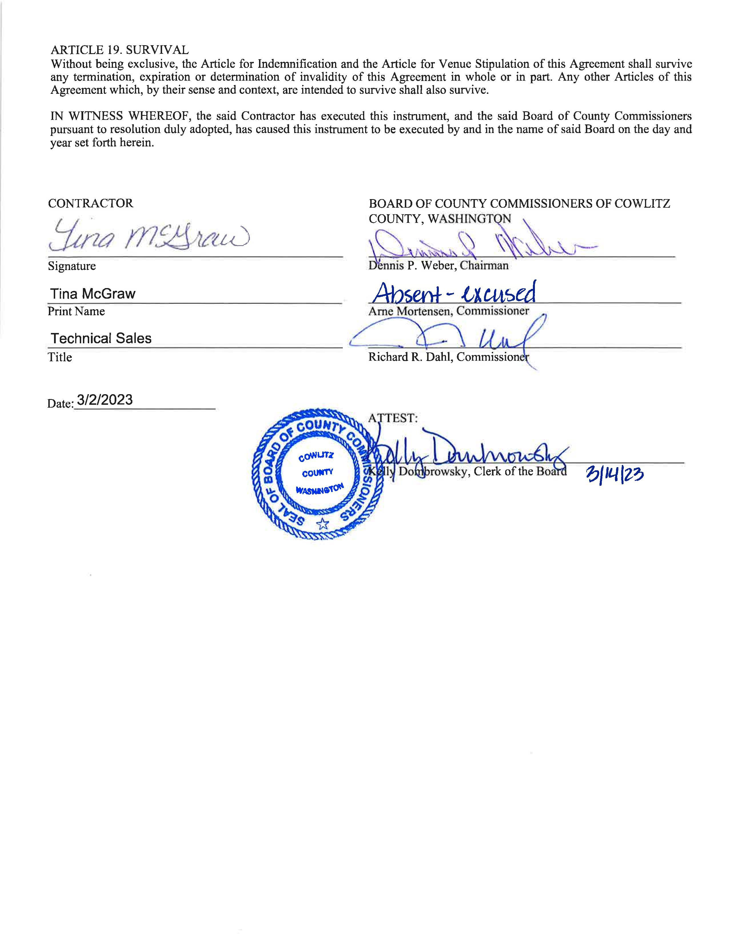 ATTEST: BOARD OF COMMISSIONERS COWLITZ COUNTY, WASHINGTON