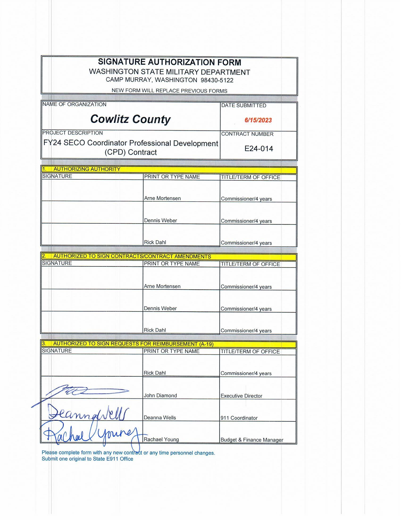 Cowlitz 911 recommends the approval of contract E24-014 for Coordinator Professional Development FY24.