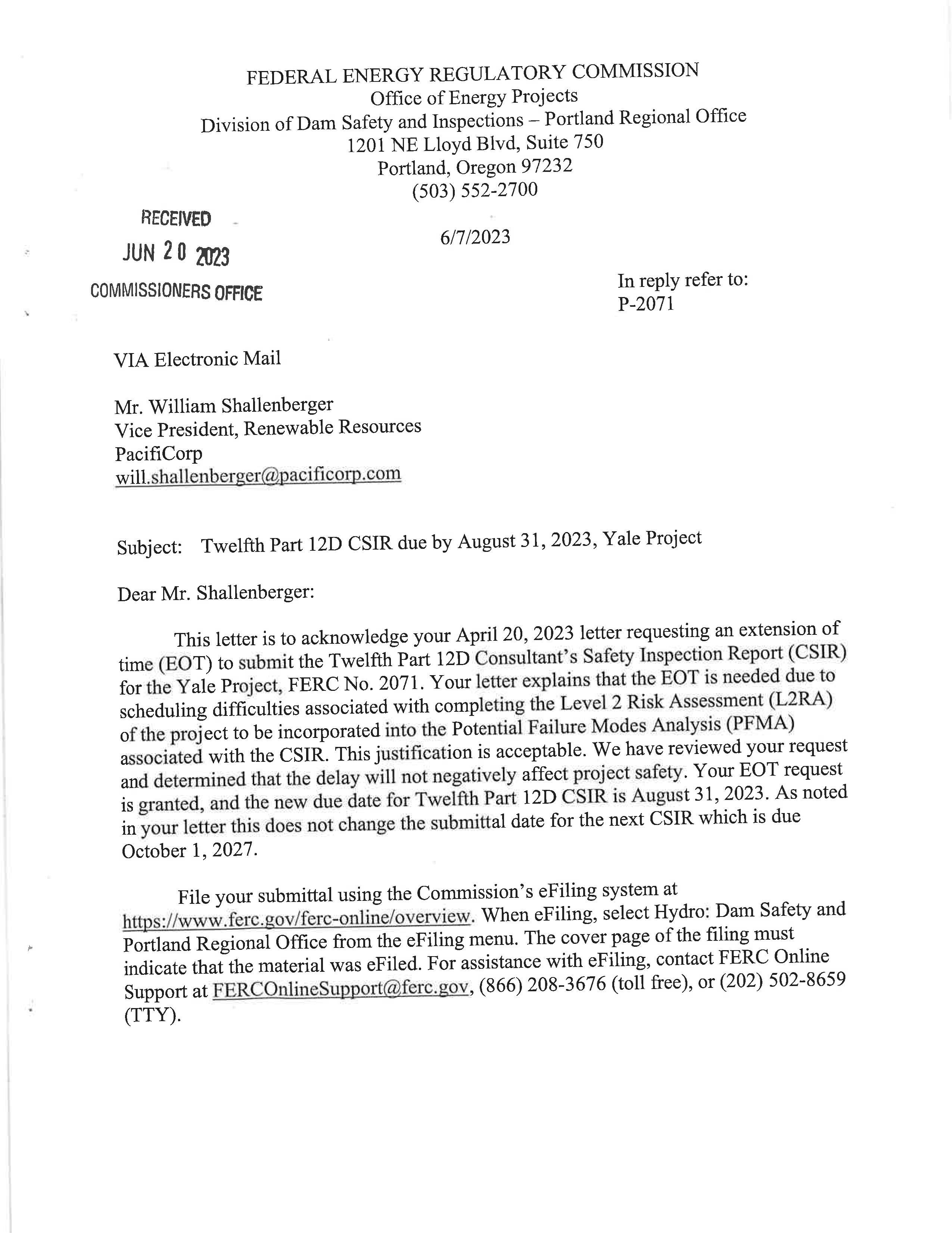 FERC Notice dated 6/7/2023 Twelfth Part 12D CSIR due by 8/31/23, Yale Project