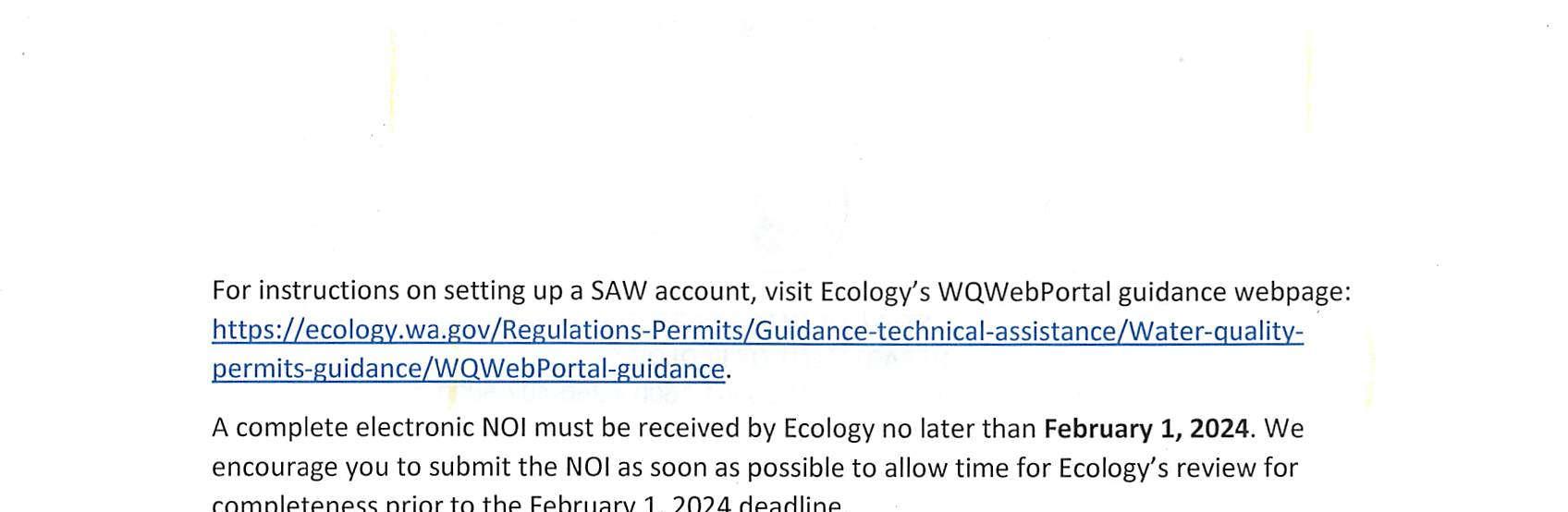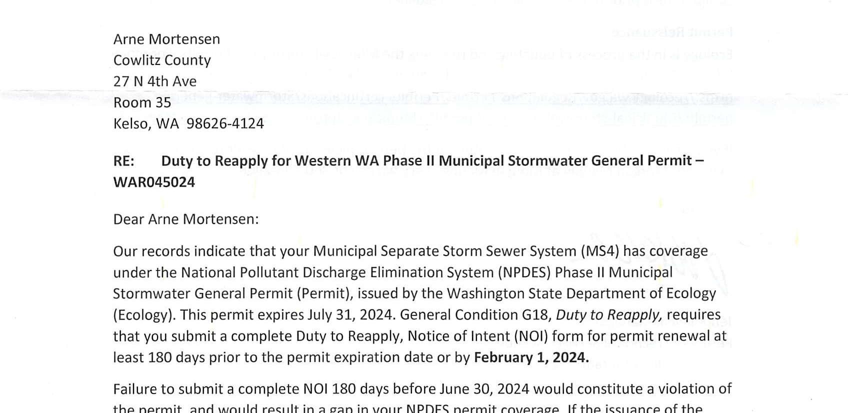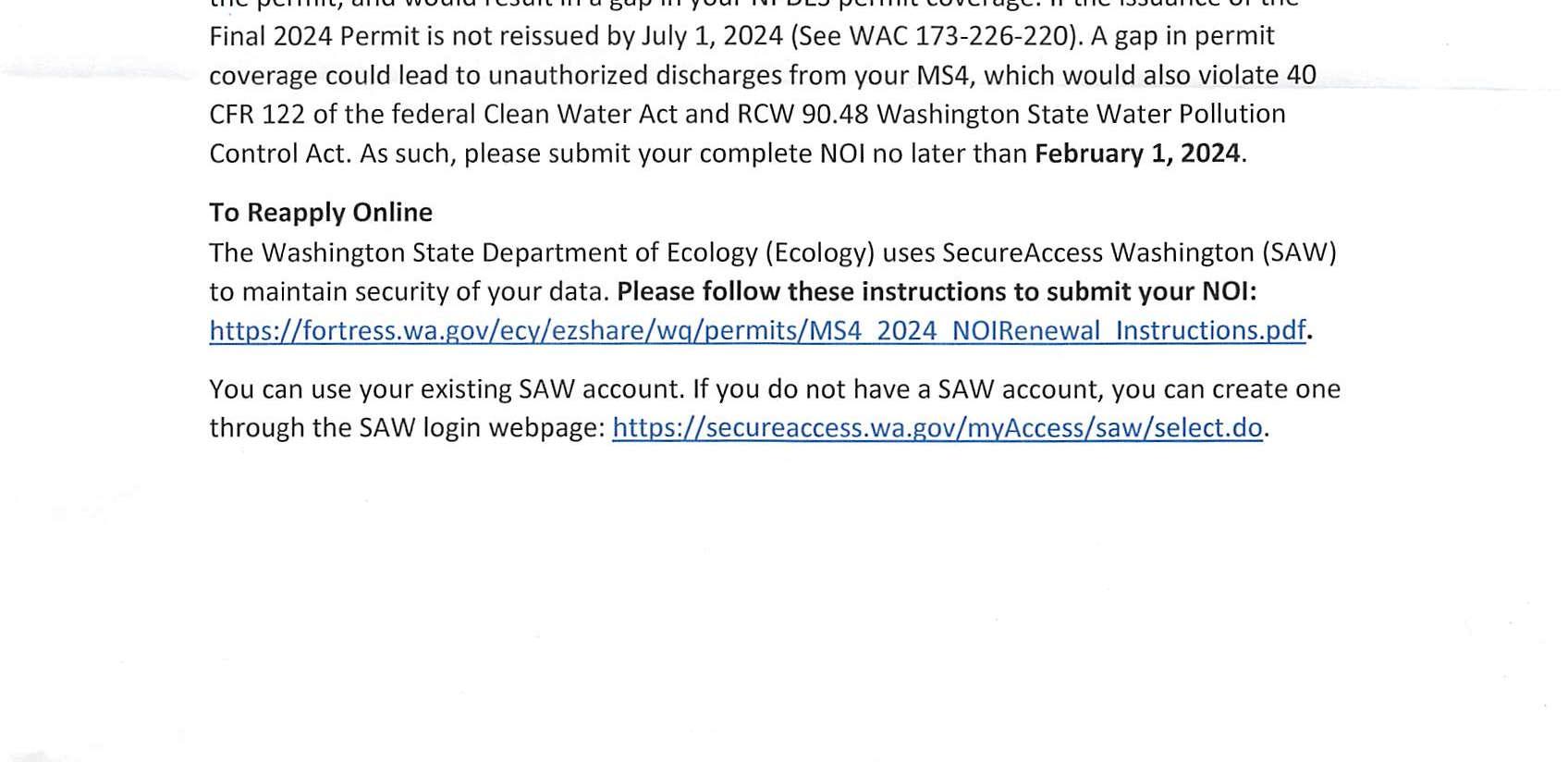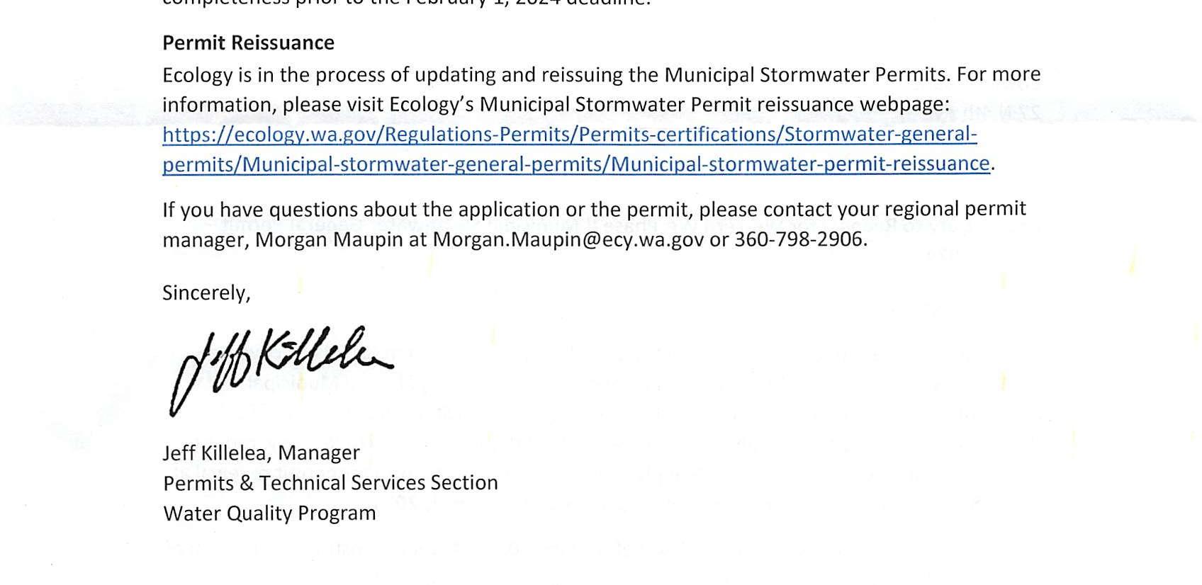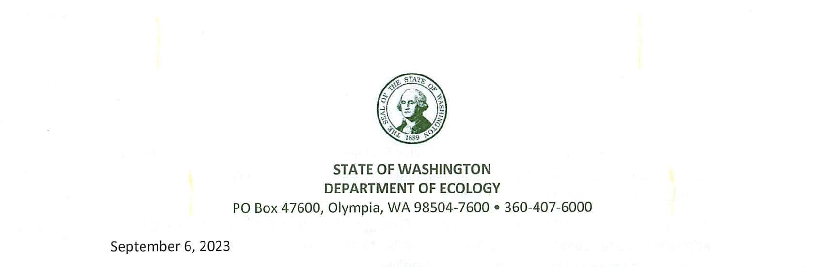a. Letter 9/6/2023 from State of Washington Dept of Ecology regarding the duty to reapply for Western WA Phase II Municipal Stormwater General PermitWAR045024.