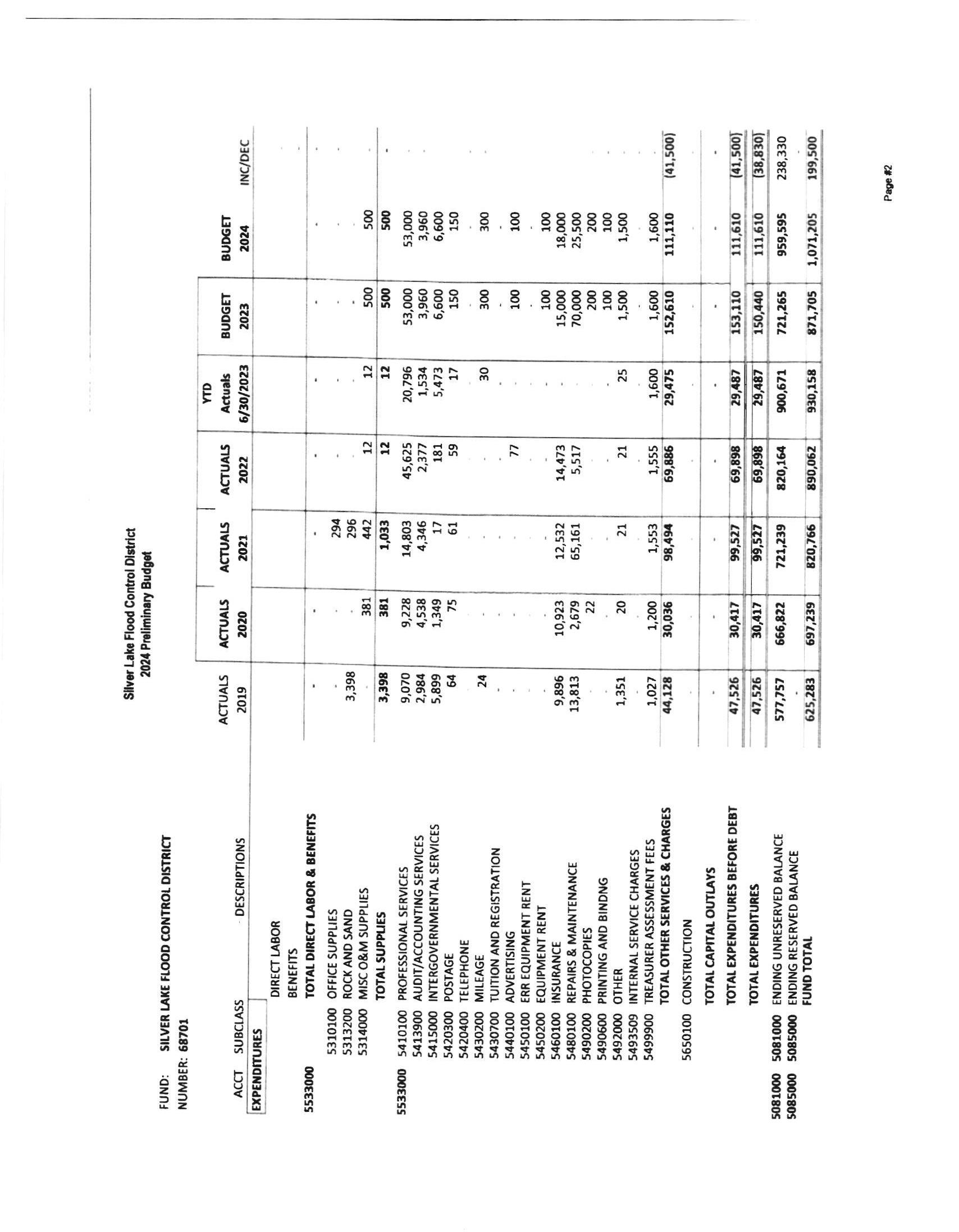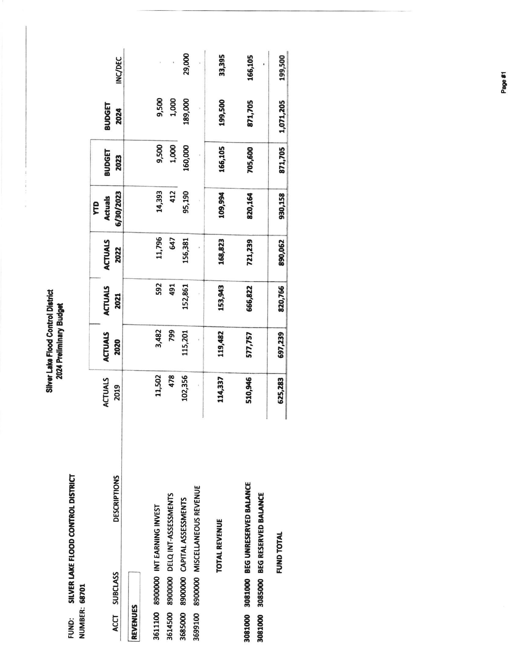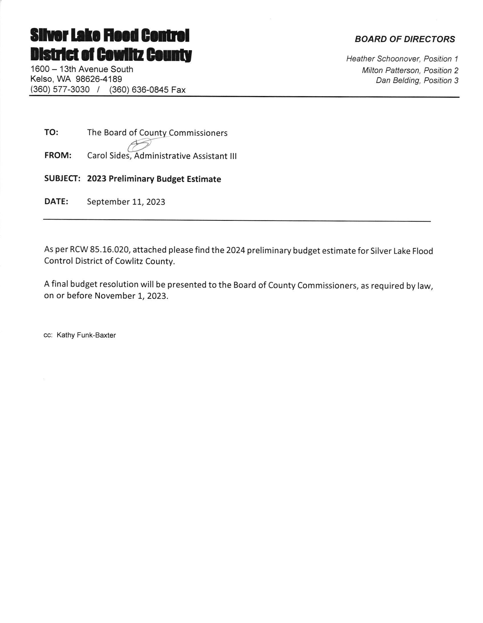 c. Memo dated 9/11/2023 regarding the 2024 Preliminary Budget Estimate for Silver Lake Flood Control District of Cowlitz County.