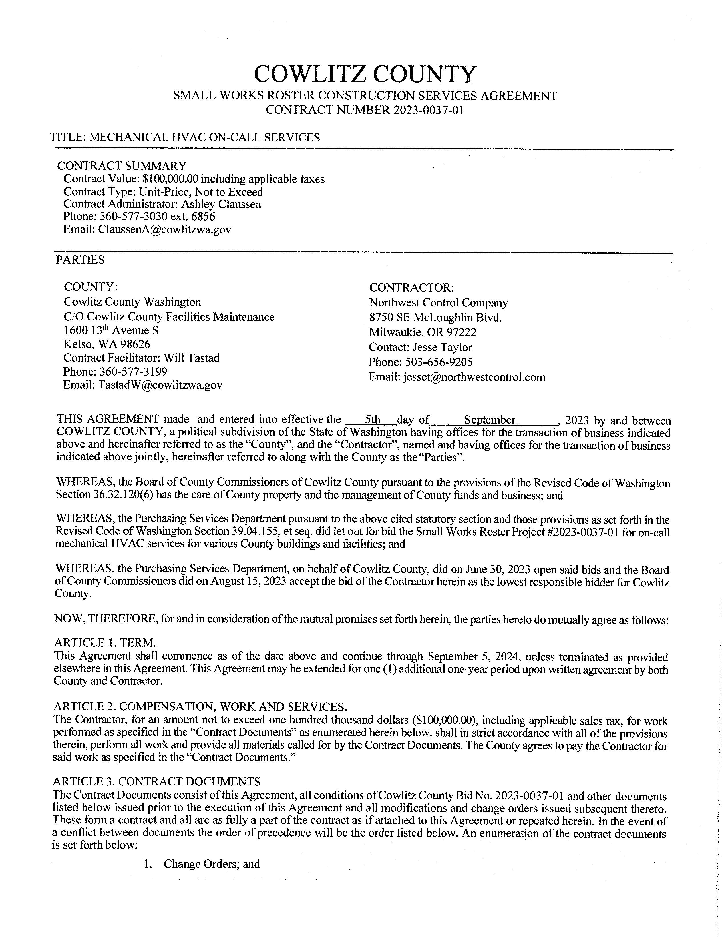 3. Contract Execution with Northwest Control Company for as-needed HVAC maintenance and repair services. The agreement amount shall not exceed $100,000.00.
