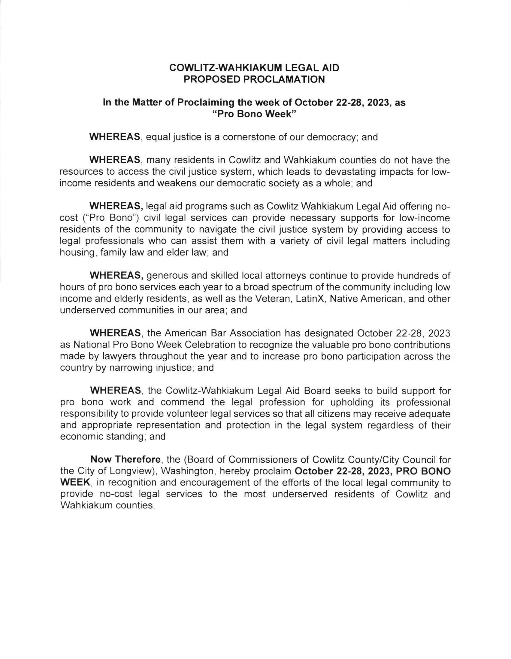 1. Proposed Proclamation - Wahkiakum Legal Aid "Pro Bono Week" October 22-28, 2023