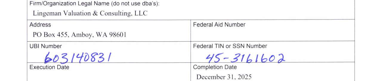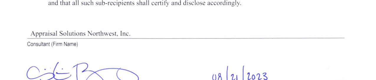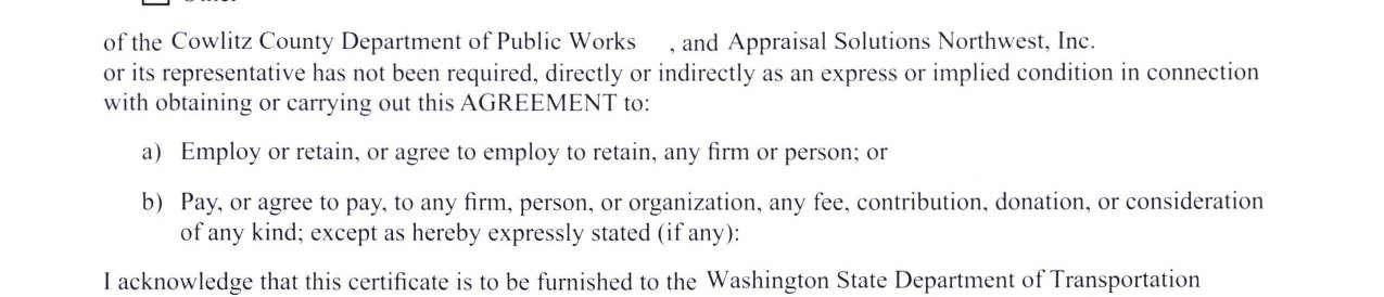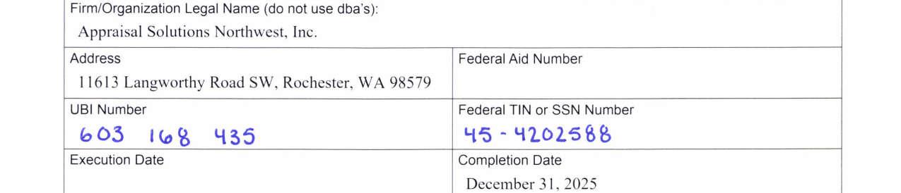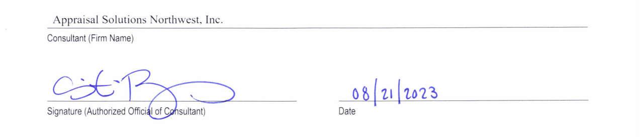 6. Local Agency Real Estate Professional Services Agreement with Appraisal Solutions Northwest, Inc. to provide services pertaining to real estate appraisals and appraisal reviews for all property types that conform with federal and agency standards. The total compensation shall not exceed $50,000 and shall be in effect until December 31, 2025, unless otherwise terminated.