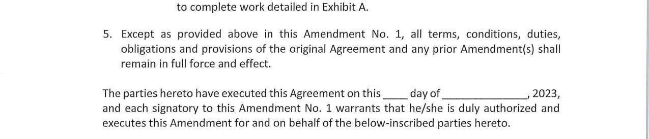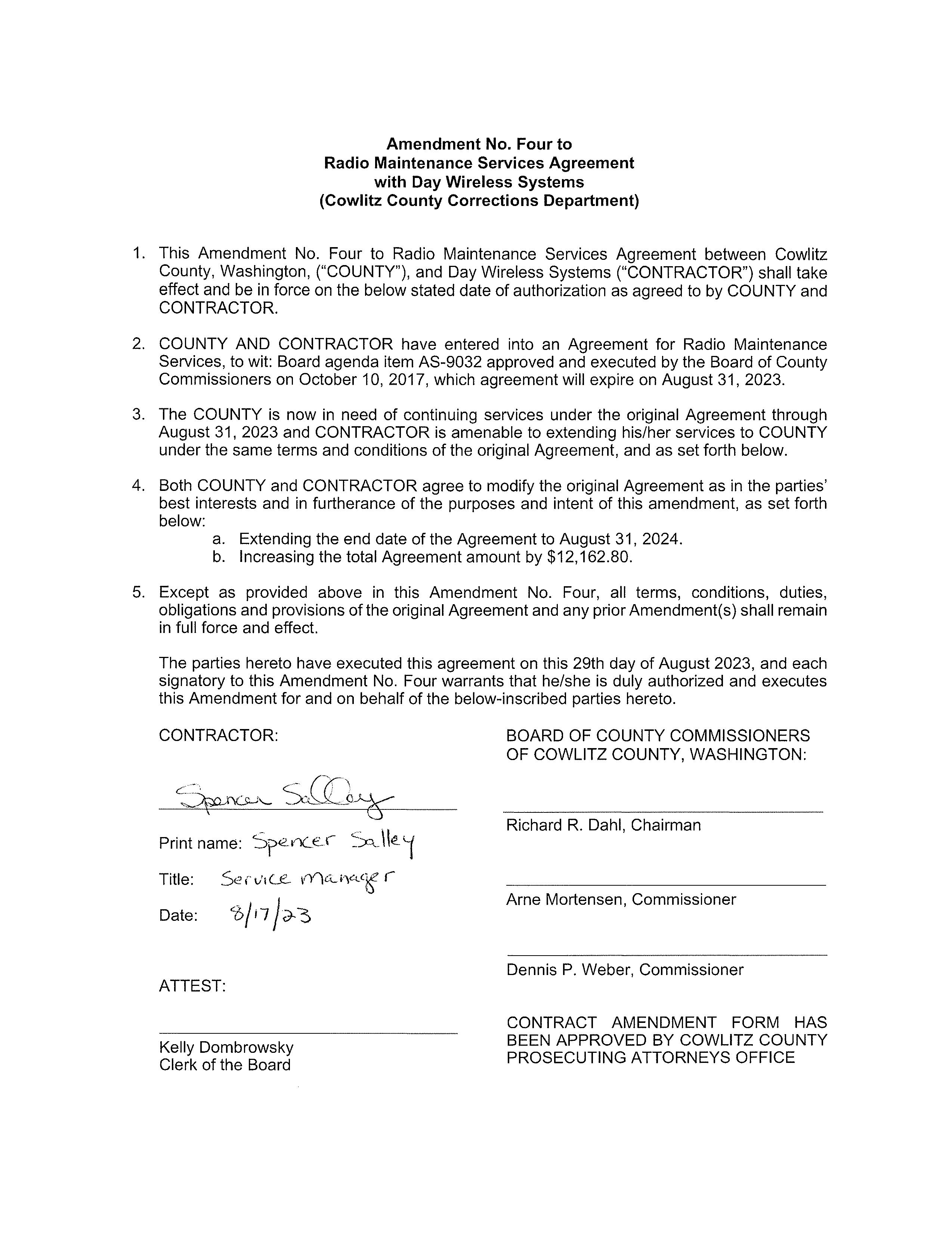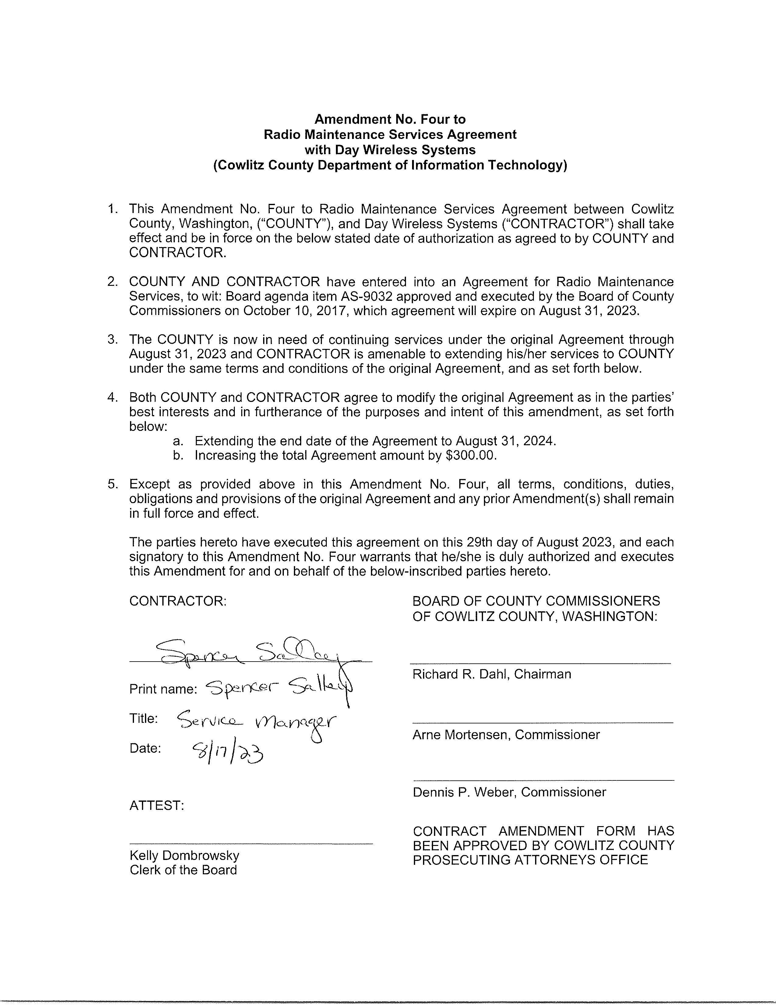 4. Amendment No. 4 to the Personal Services Agreements with Day Wireless Systems for radio services and maintenance for one additional year for an end date of August 31, 2024. The total for all 2023-2024 agreements is $27,453.59, an increase of $592.88.