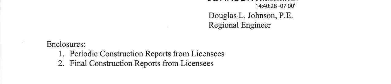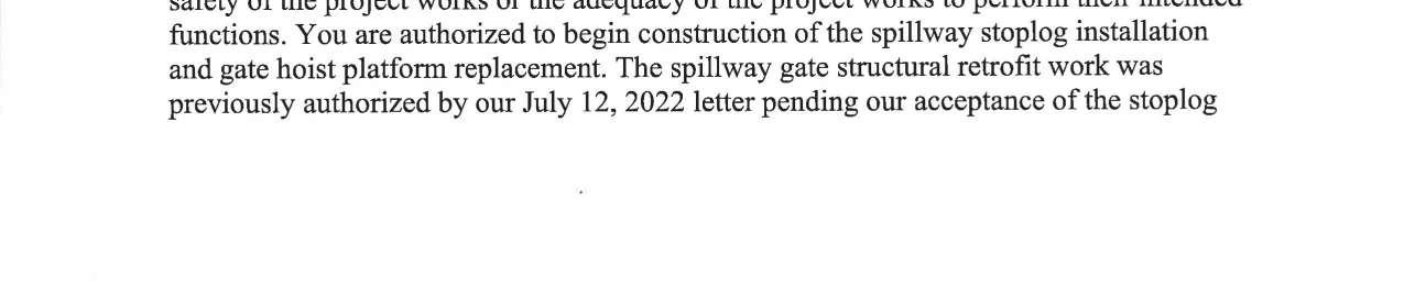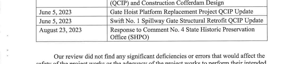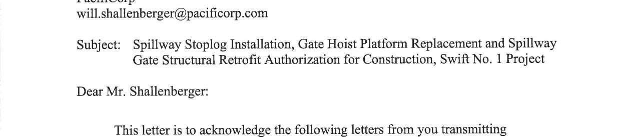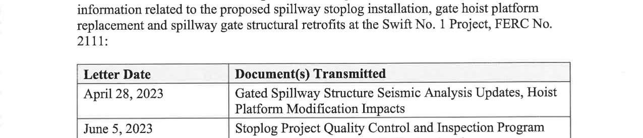 c. Federal Energy Regulatory Commission (FERC) Notice dated 8/24/2023 regarding Spillway Stoplog Installation, Gate Hoist Platform Replacement and Spillway Gate Structural Retrofit Authorization for Construction, Swift No. 1 Project