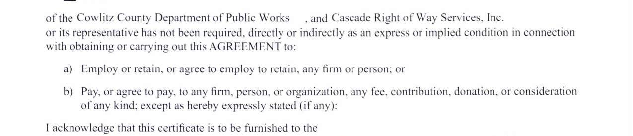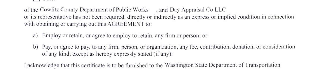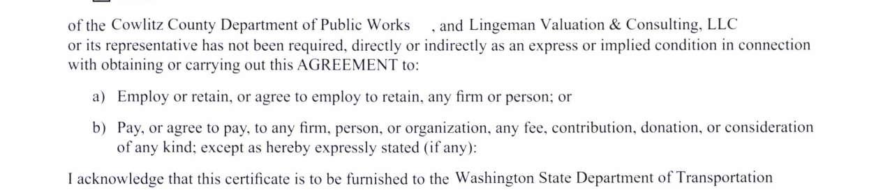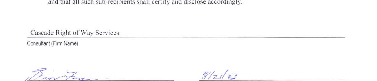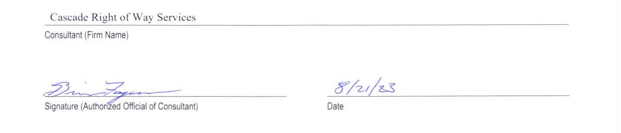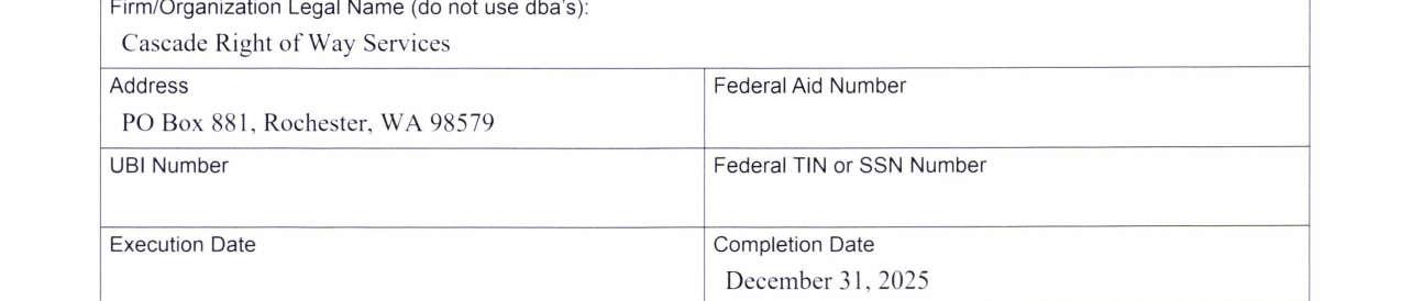 10. Local Agency Real Estate Professional Services Agreement with Cascade Right of Way Services to provide services pertaining to real estate acquisition for all property types that conform with federal and agency standards. The total compensation shall not exceed $100,000 and shall be in effect until December 31, 2025, unless otherwise terminated.