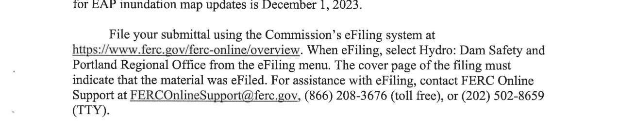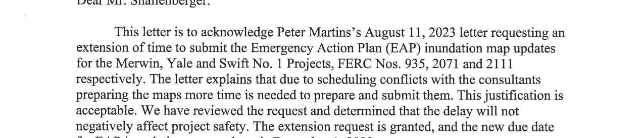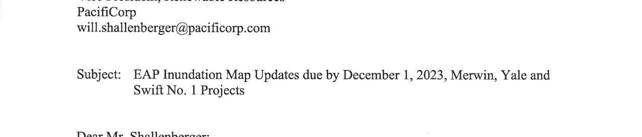 d. Federal Energy Regulatory Commission (FERC) Notice dated 8/24/2023 regarding EAP Inundation Map Updates due by December 1, 2023, Merwin, Yale and Swift No. 1 Projects.