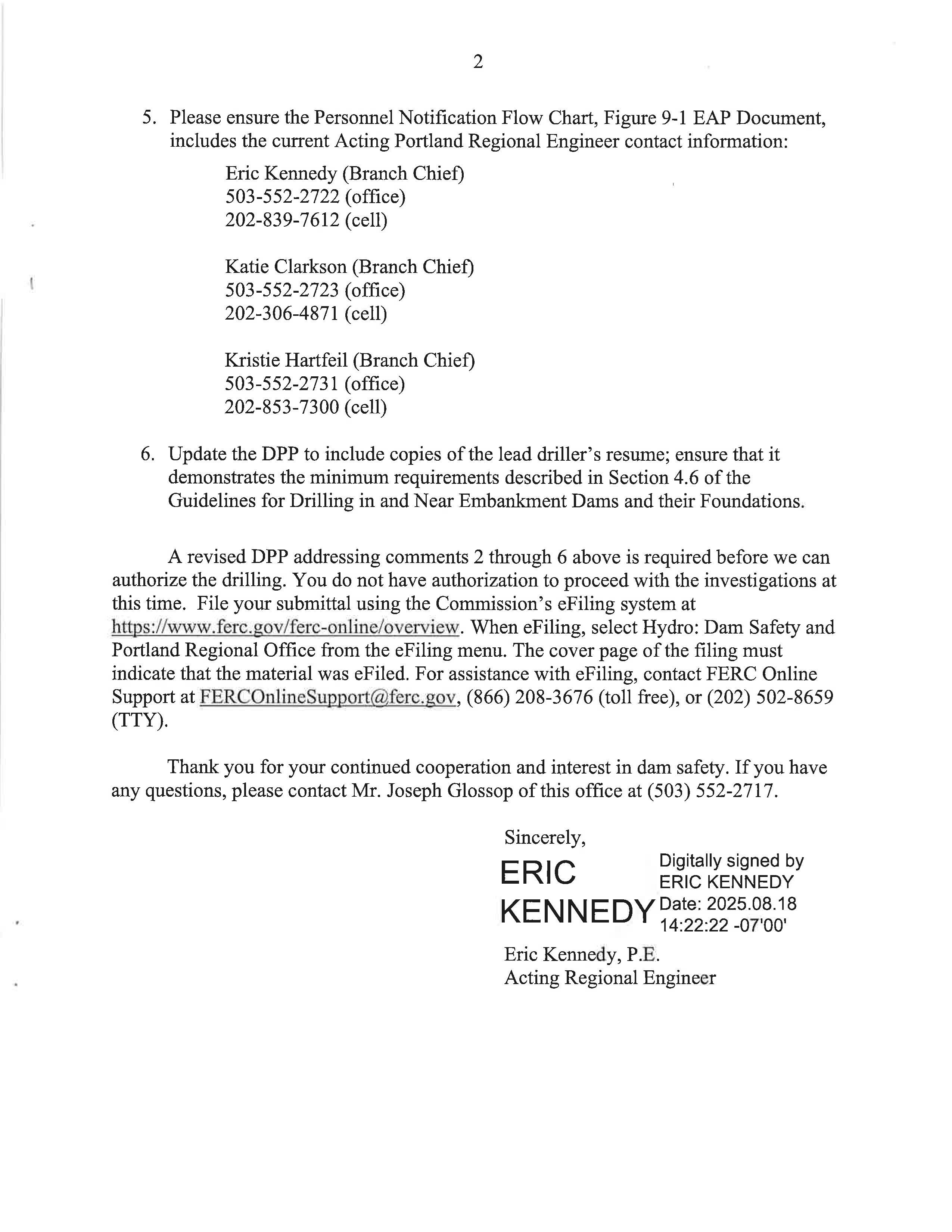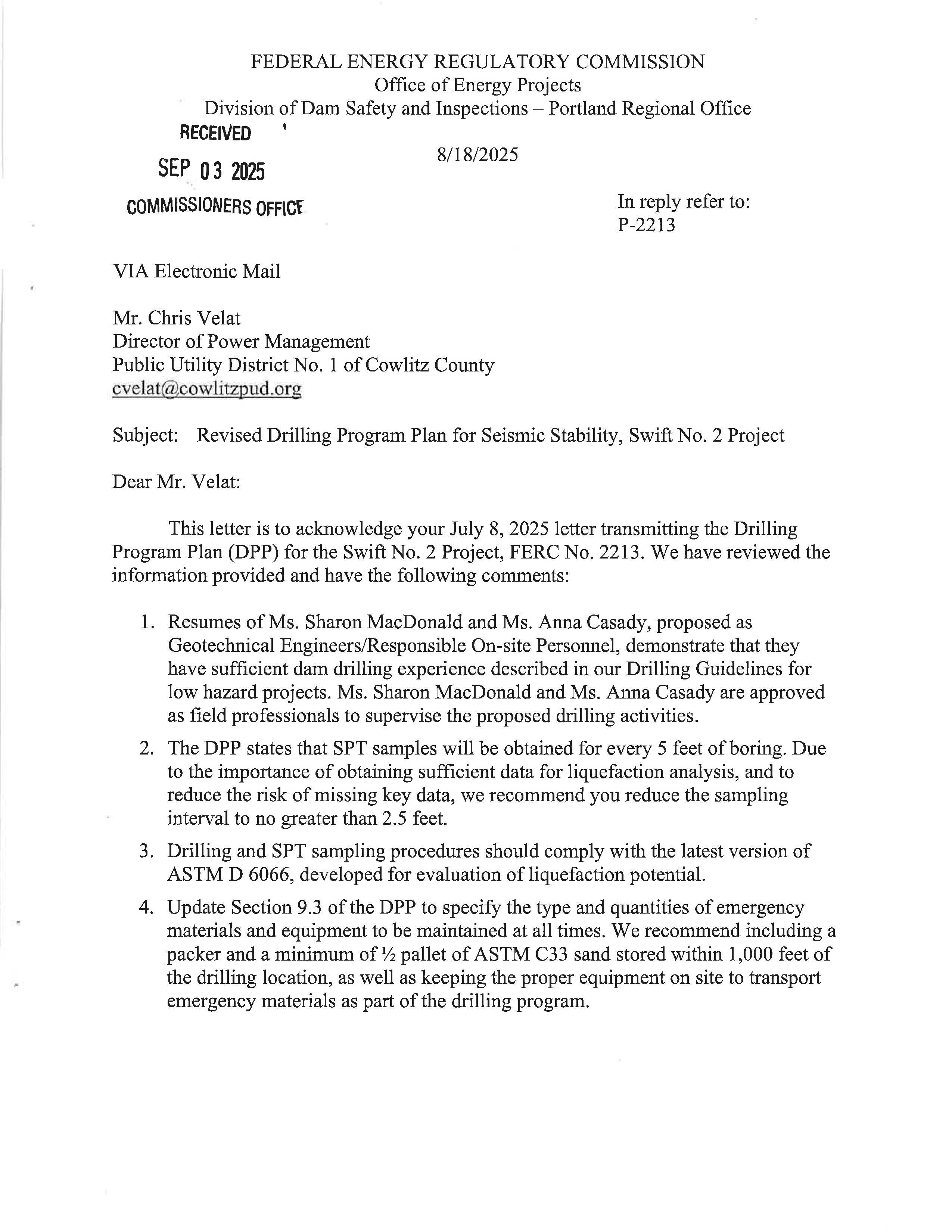 b. Federal Energy Regulatory Commission (FERC) Notice dated 8/18/25 regarding Revised Drilling Program Plan for Seismic Stability, Swift No. 2 Project. (14328)