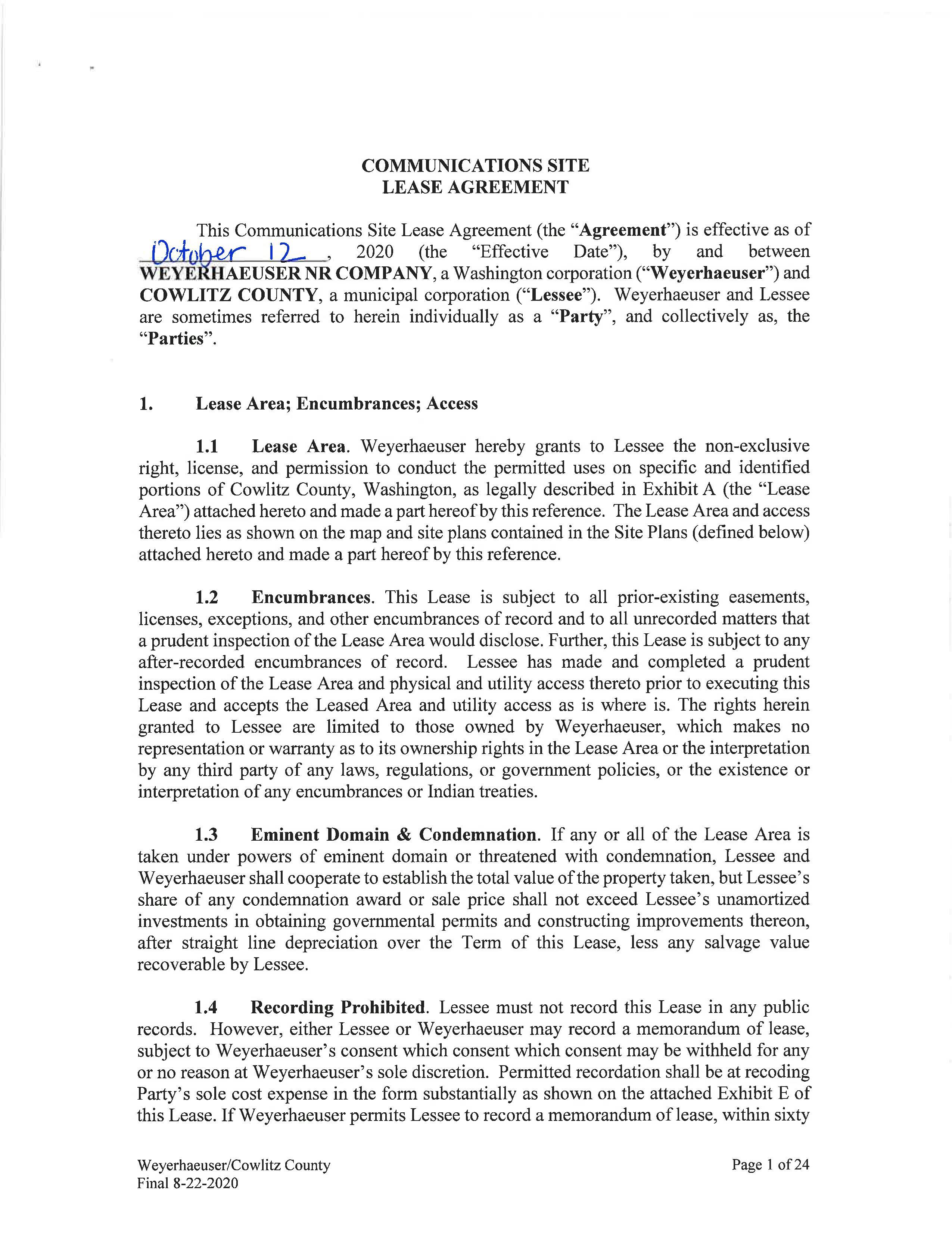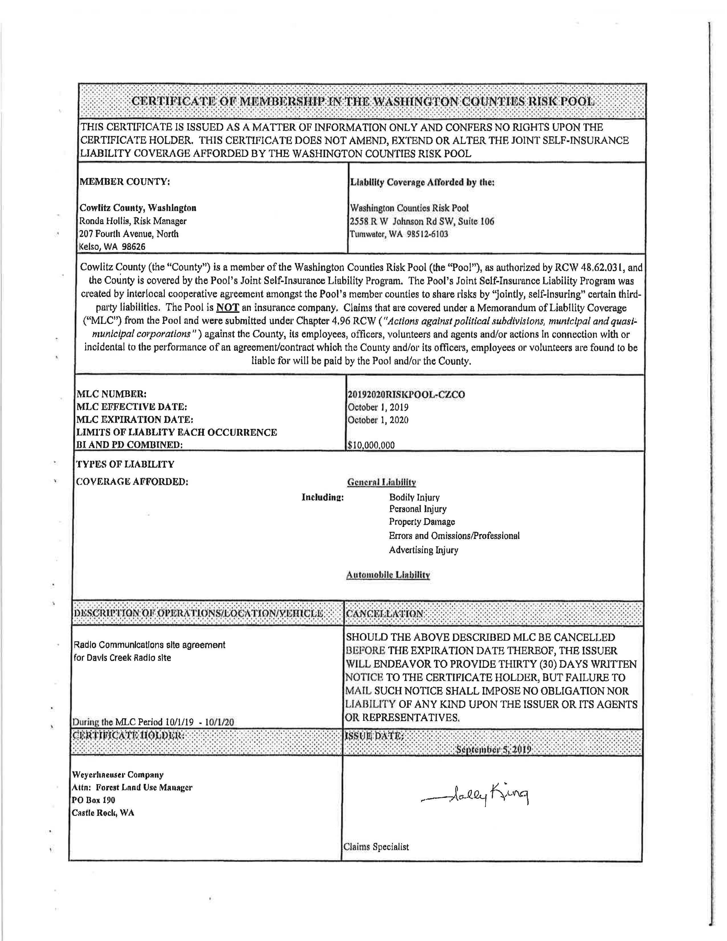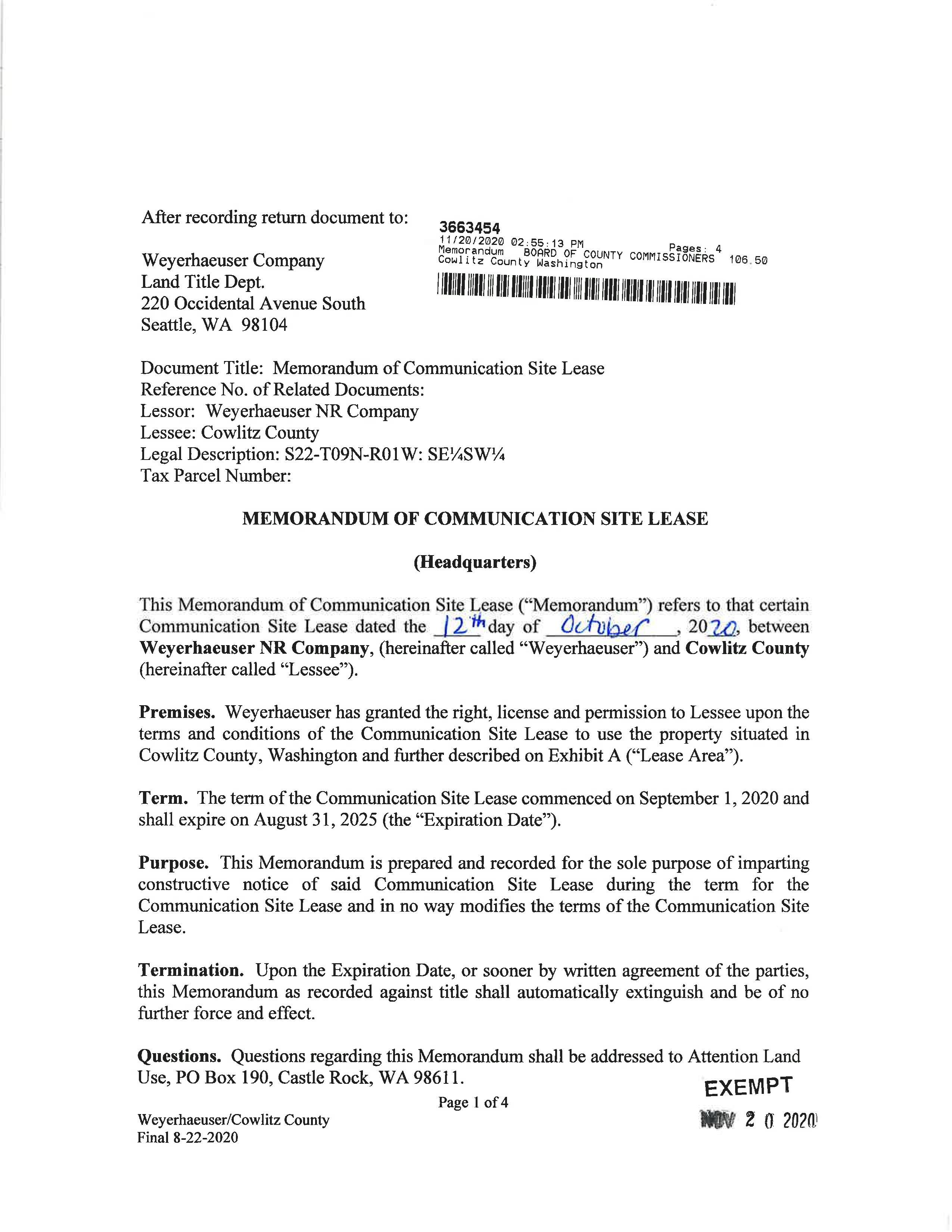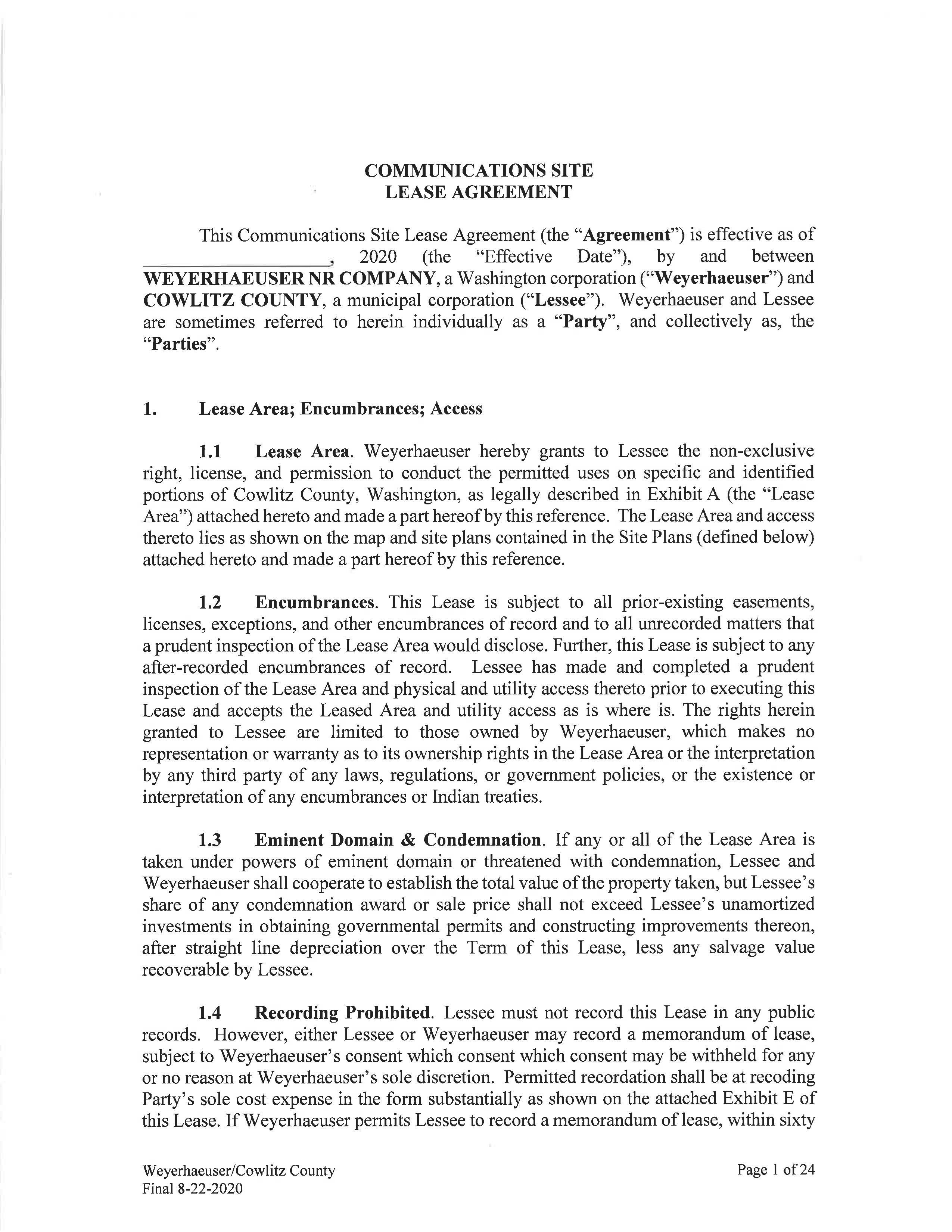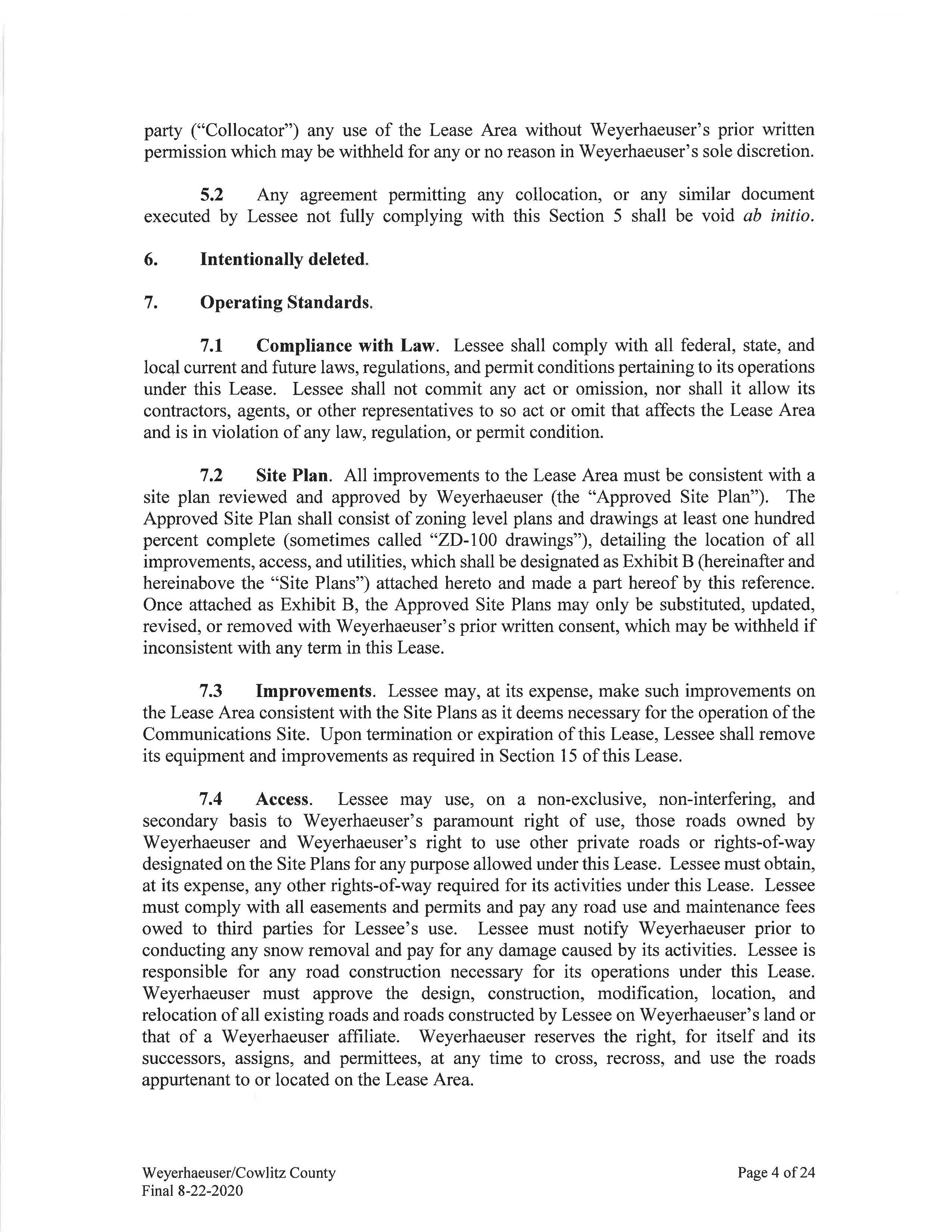 5. First Amendment to the Communications Site Lease between Weyerhaeuser Company to allow access to Weyerhaeuser's 199’ ROHN 45 Tower for a Point-to-Point Wireless Network System to improve internet speeds at the Headquarters Landfill and Authorize the Chairman to Execute the Document. (14324)