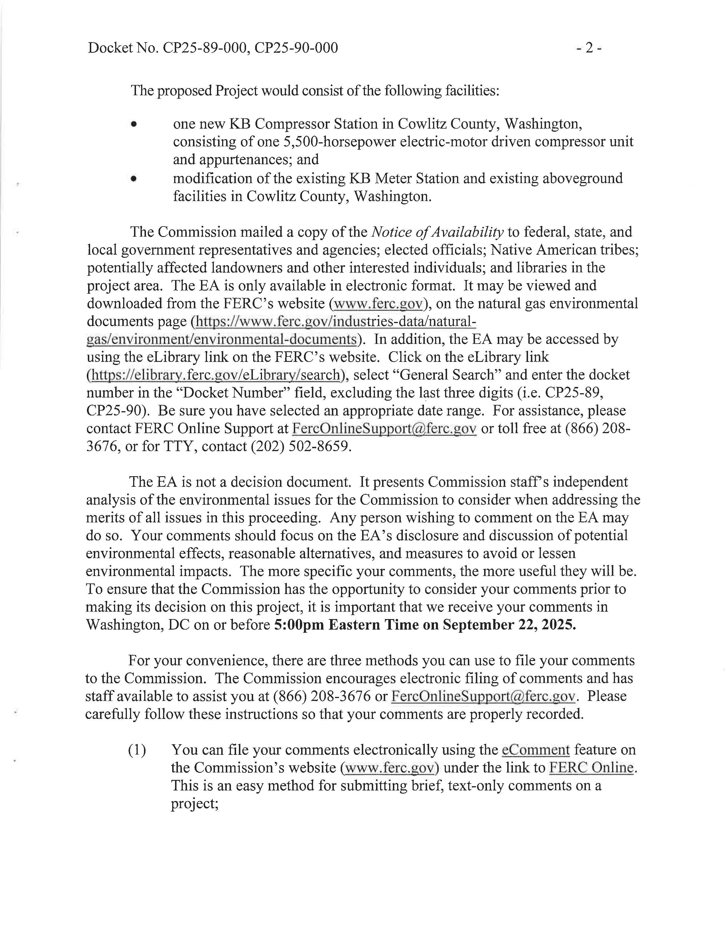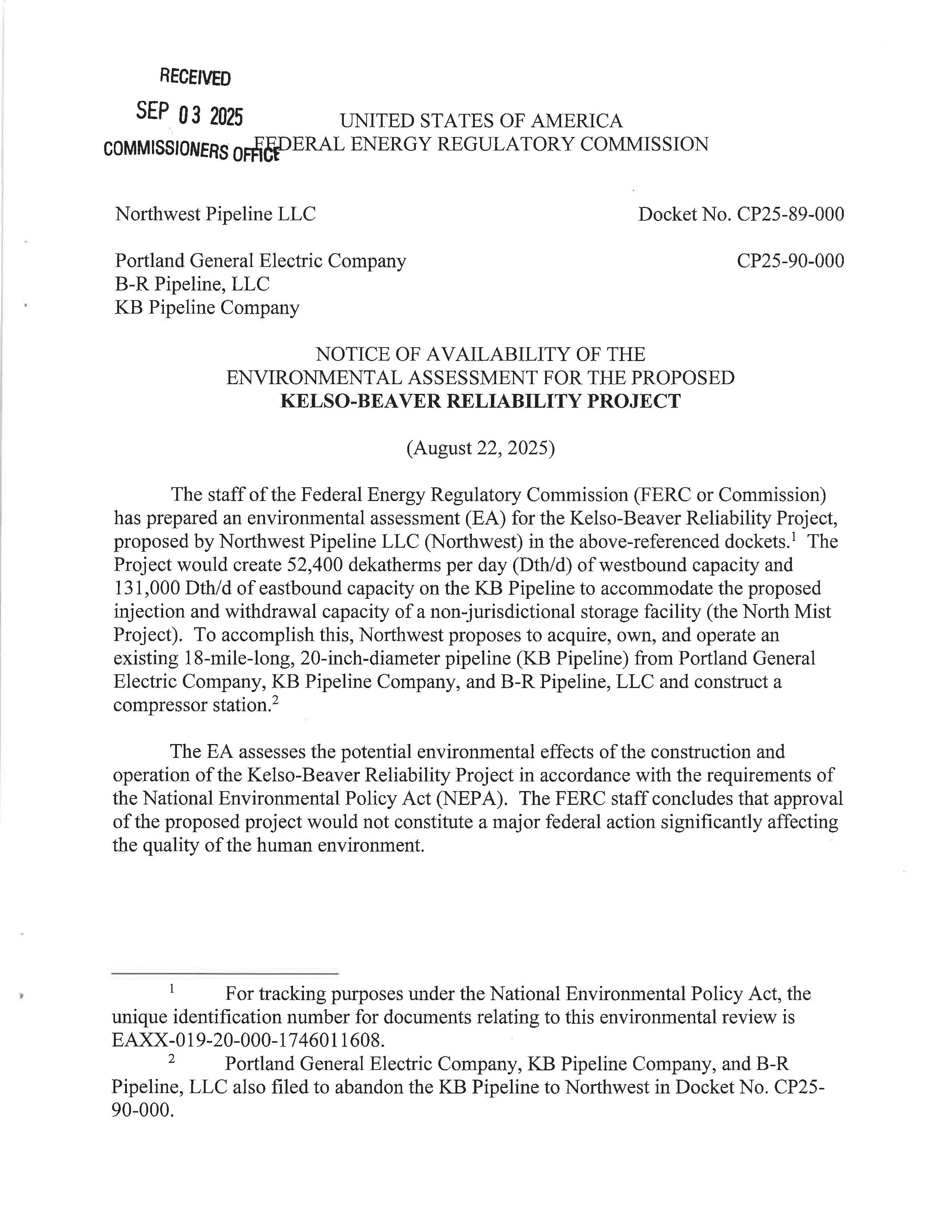 c. Federal Energy Regulatory Commission (FERC) Notice dated 8/22/25 regarding Availability of the Environmental Assessment for the Proposed Kelso-Beaver Reliability Project. (14329)