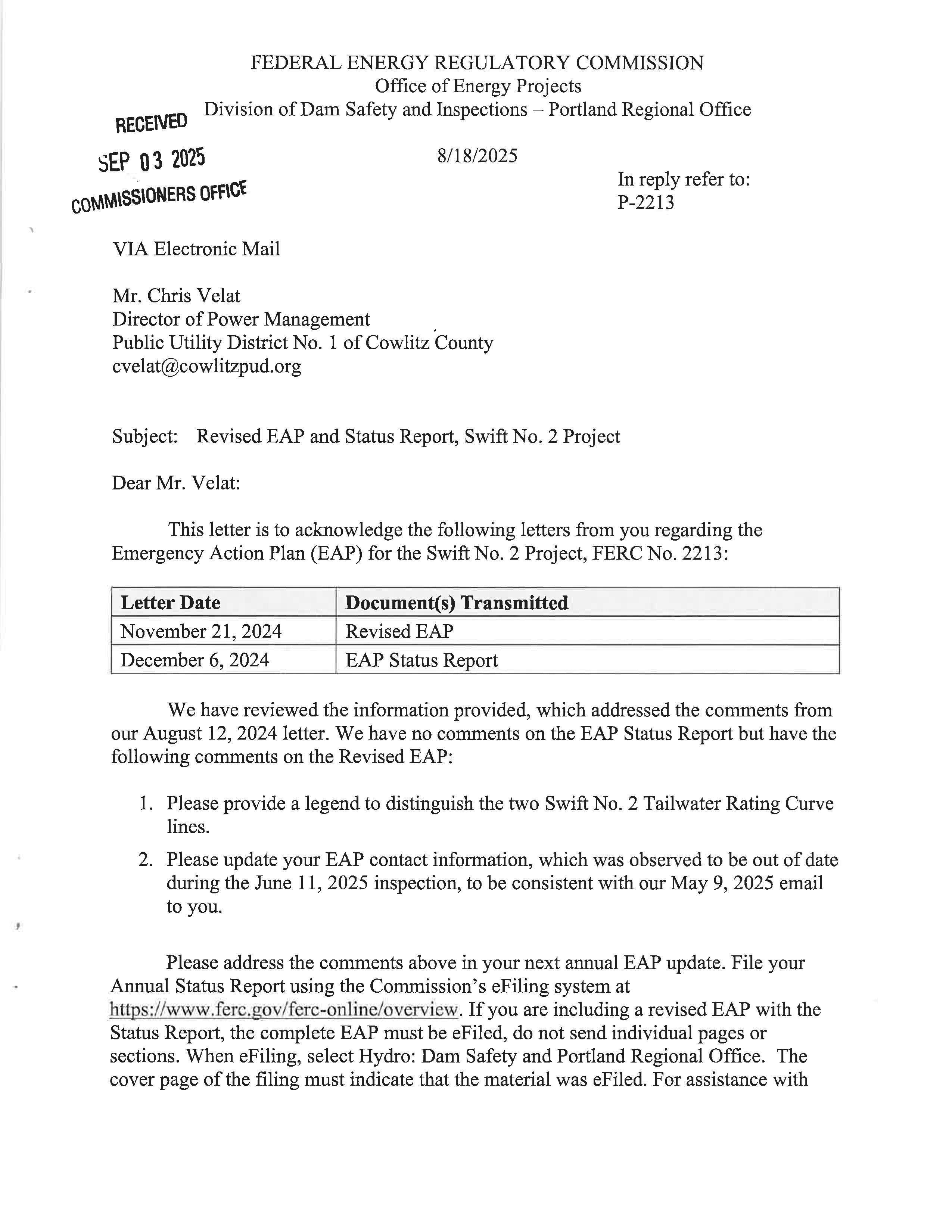 a. Federal Energy Regulatory Commission (FERC) Notice dated 8/18/25 regarding Revised EAP and Status Report, Swift No. 2 Project. (14331)