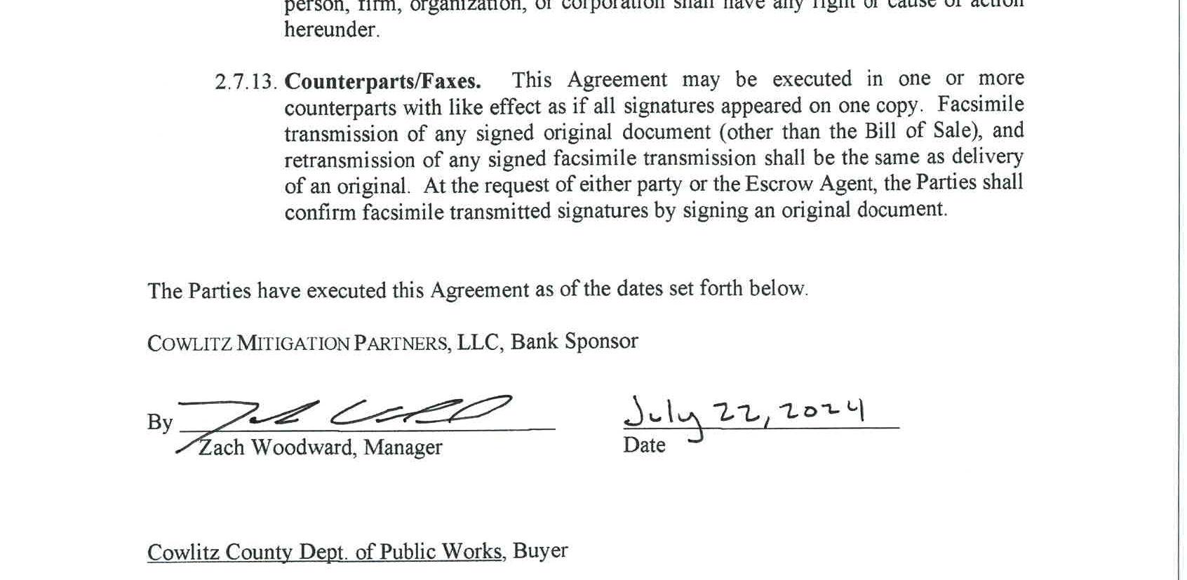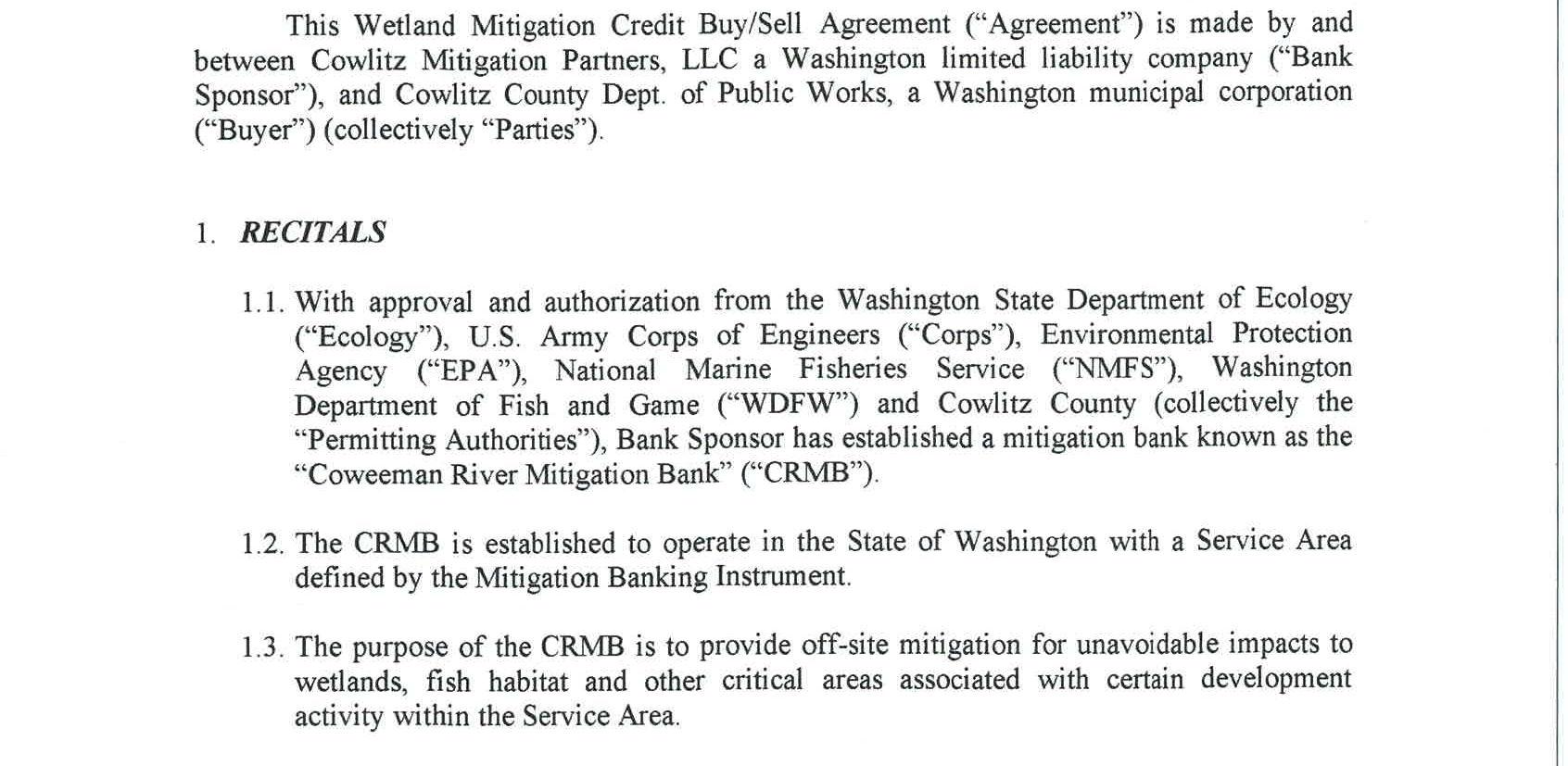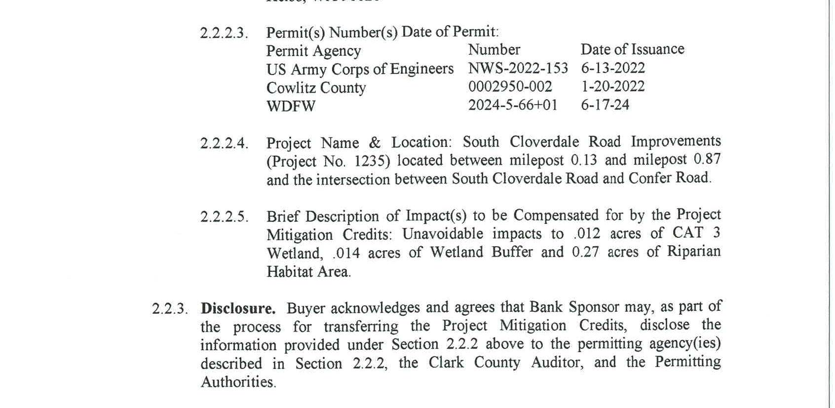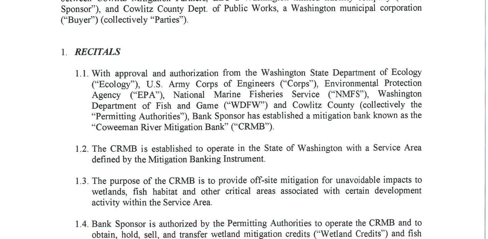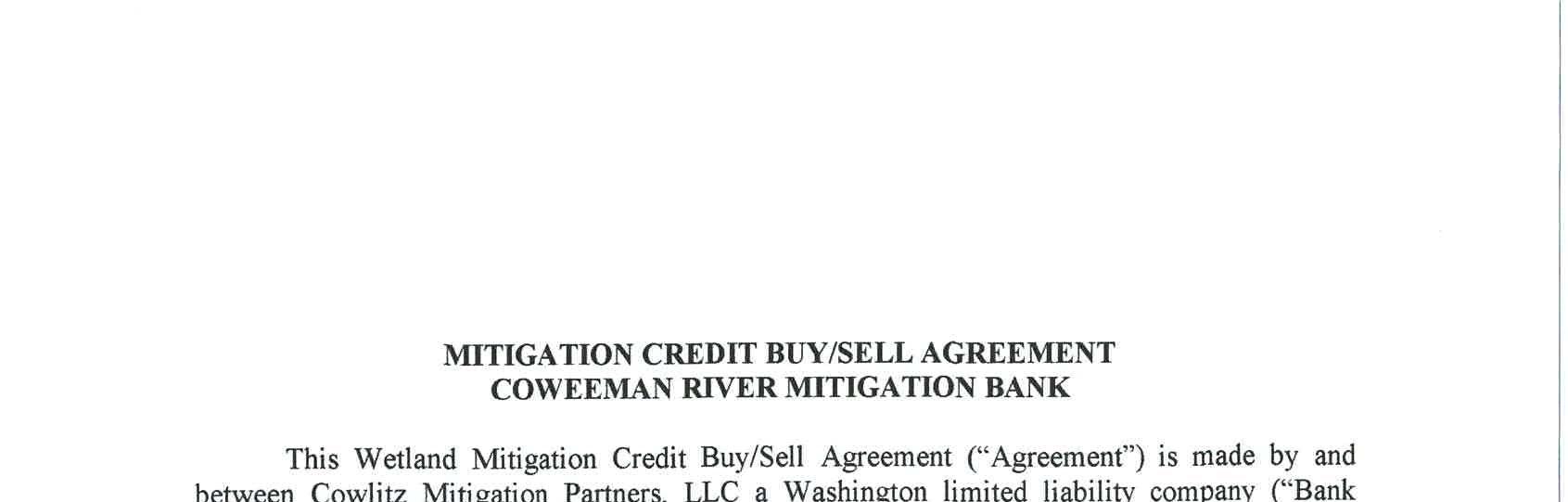 4. Mitigation Credit Buy/Sell Agreement with Cowlitz Mitigation Partners, LLC for use of the Coweeman River Mitigation Bank to satisfy the wetland and critical area impacts of the South Cloverdale Road Improvement Project. The cost fortheuse of the mitigation bank is $21,995.00.