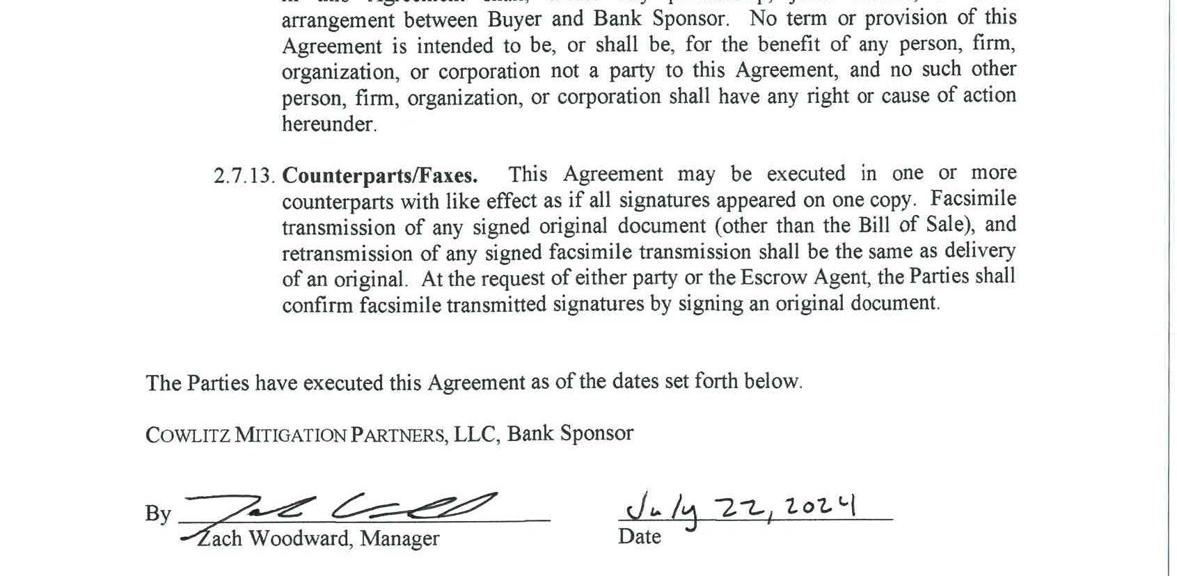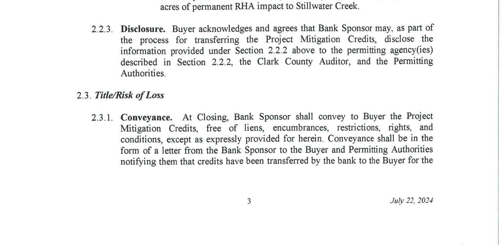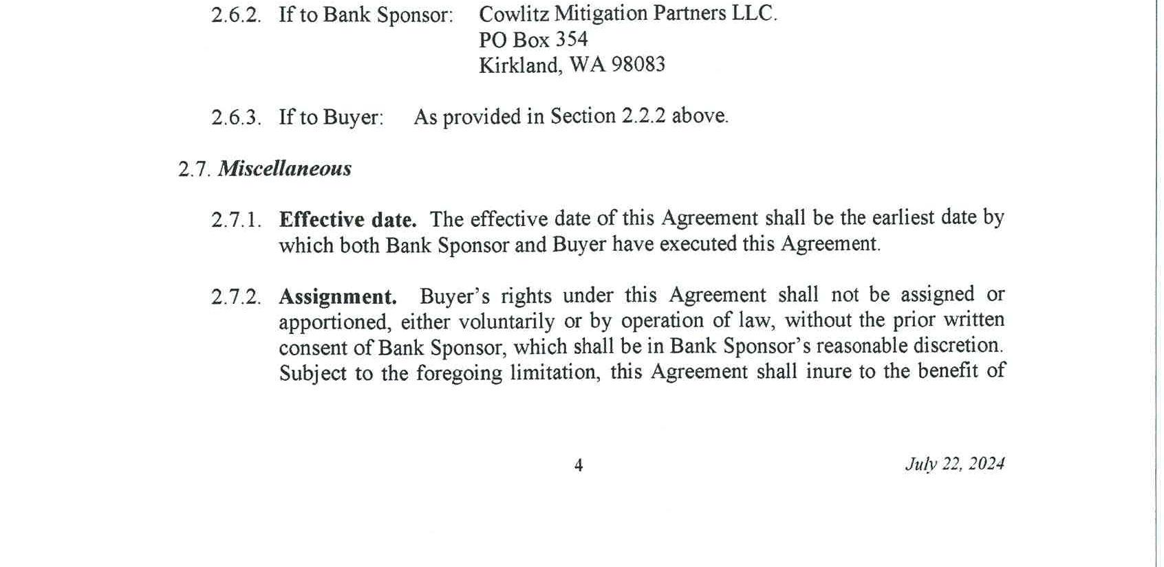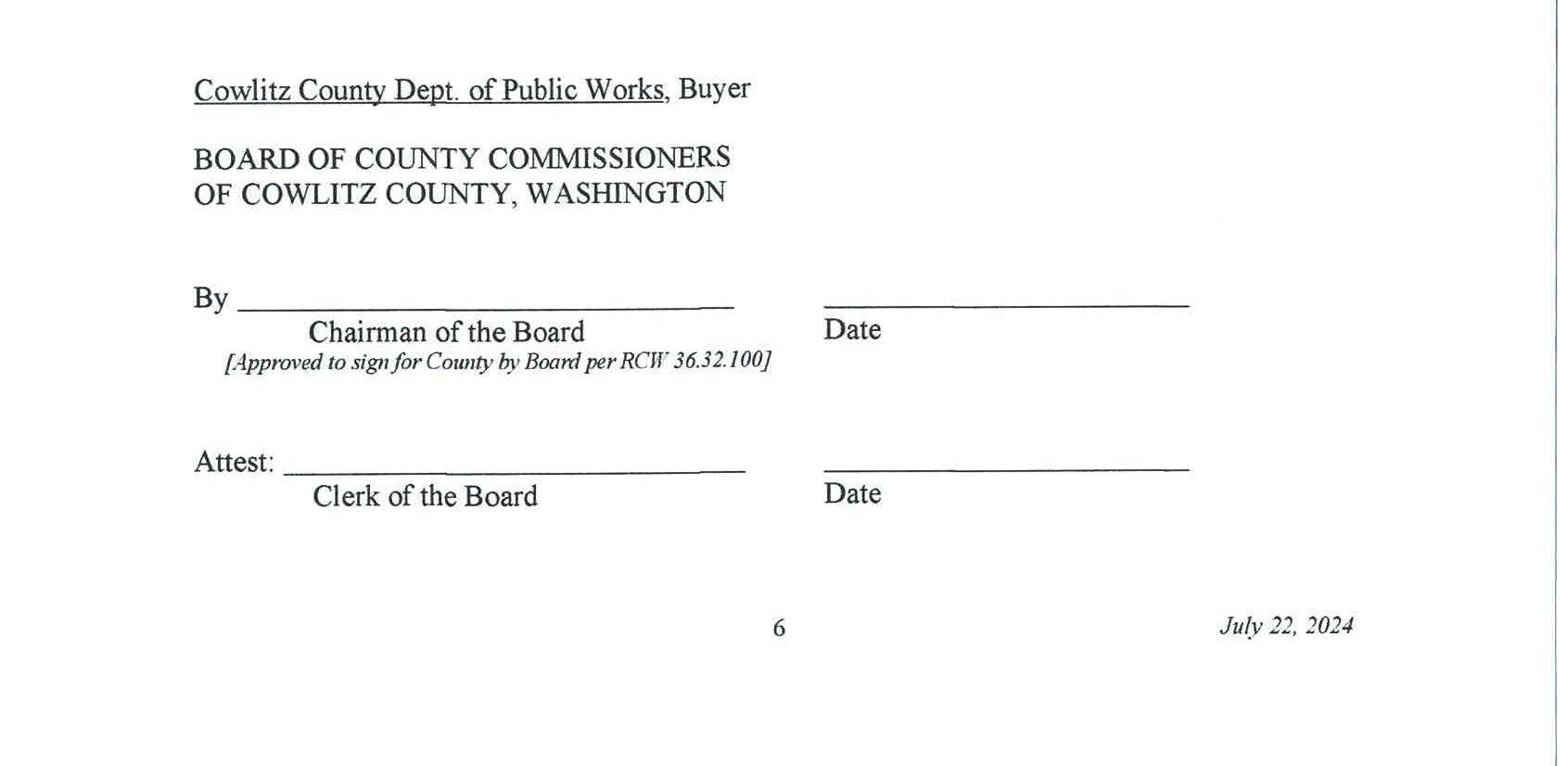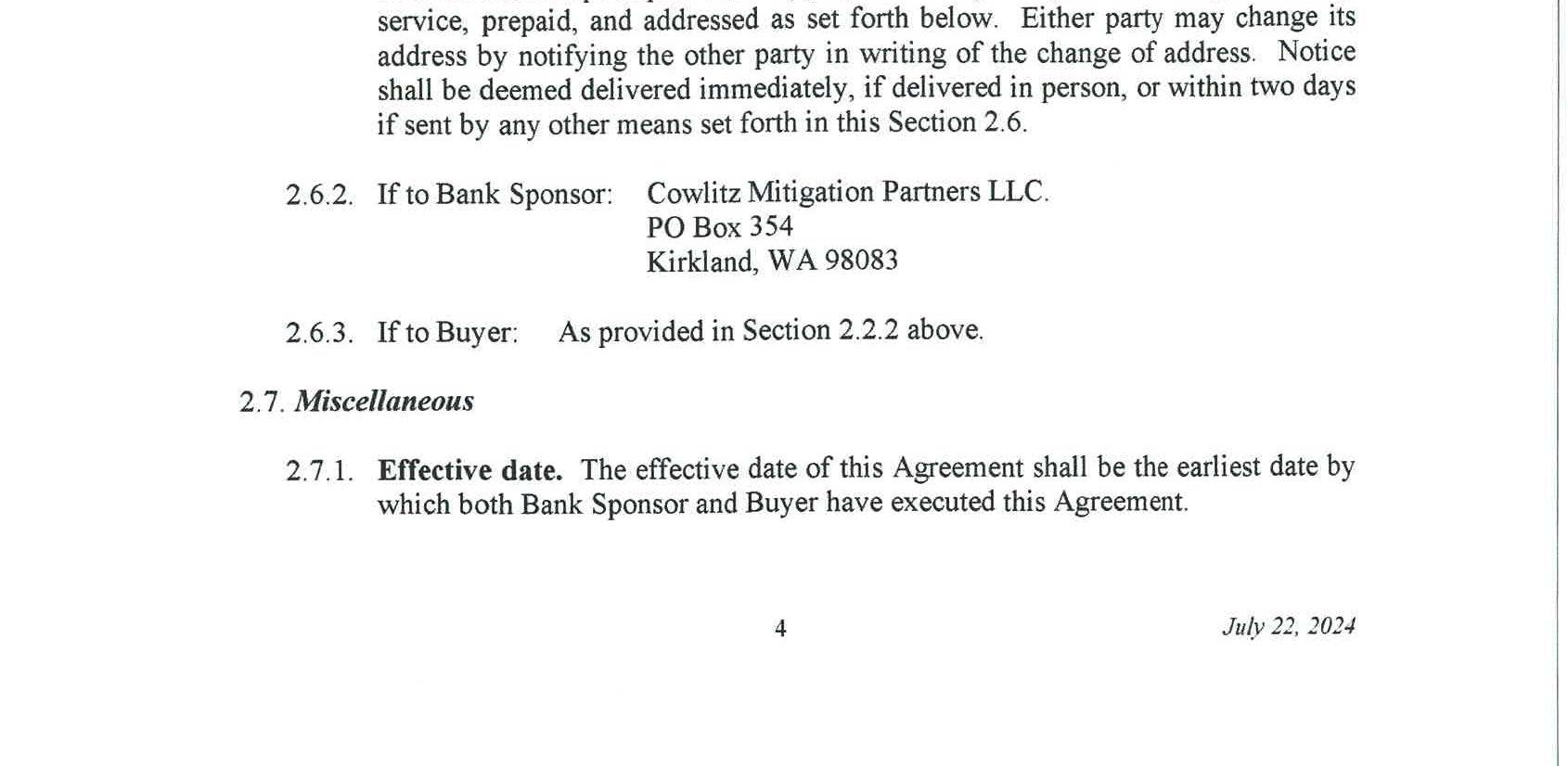 4. Mitigation Credit Buy/Sell Agreement with Cowlitz Mitigation Partners, LLC for use of the Coweeman River Mitigation Bank to satisfy the wetland and critical area impacts of the South Cloverdale Road Improvement Project. The cost fortheuse of the mitigation bank is $21,995.00.