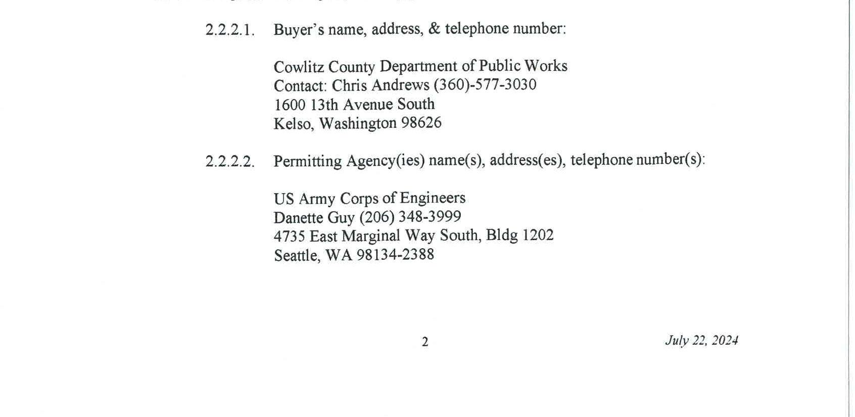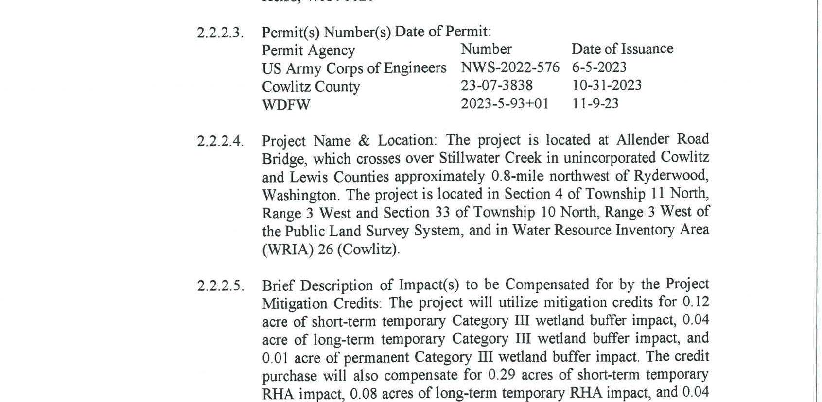 5. Mitigation Credit Buy/Sell Agreement with Cowlitz Mitigation Partners, LLC for use of the Coweeman River Mitigation Bank to satisfy the wetland and critical area impacts of the Allender Road Bridge Replacement Project. The cost for the use of the mitigation bank is $37,100.00.