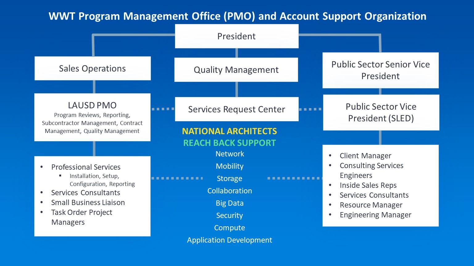 ˗ WWT staffed this effort with a Project Manager to work in conjunction with the customer to ensure successful delivery of the project. WWT’s Project Managers followed a methodology that incorporates project management best practices based closely on the Project Management Institute’s Project Management Body of knowledge and is controlled by the WWT project governance model.