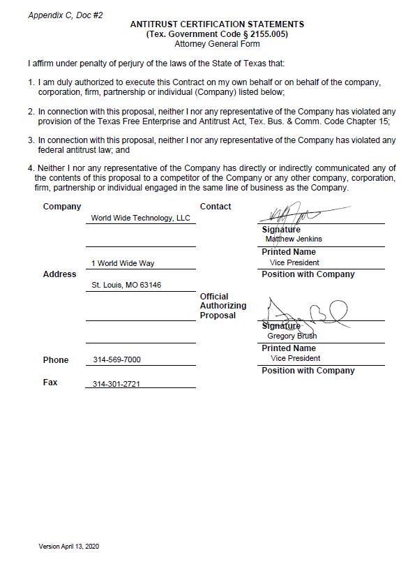 Document #2: Antitrust Certification Statements (Tex. Government Code § 2155.005)