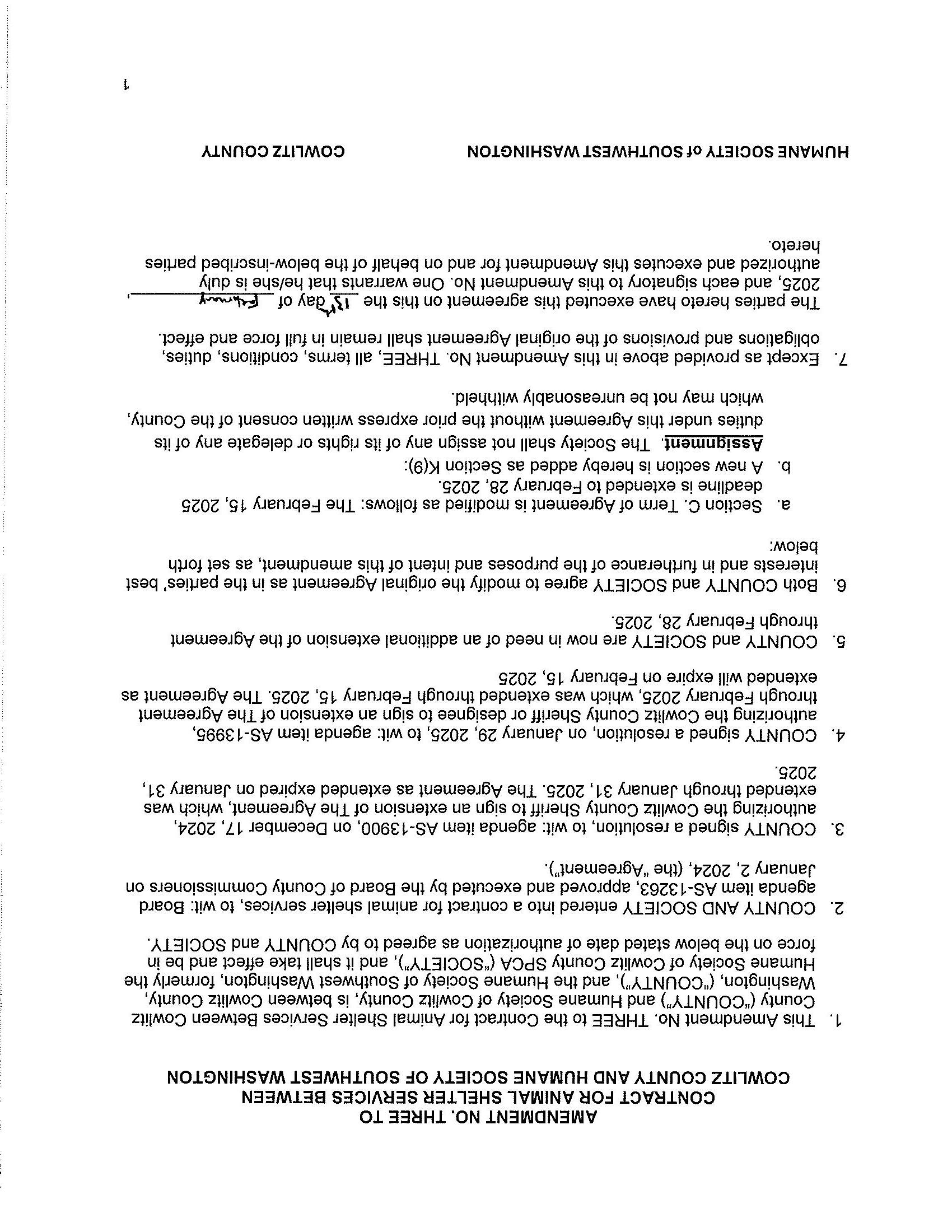 b. Signed Amendment #3 to the Contract for Animal Shelter Services with the Humane Society of Southwest Washington to extend the agreement from February 16 to February 28, 2025. (14040)