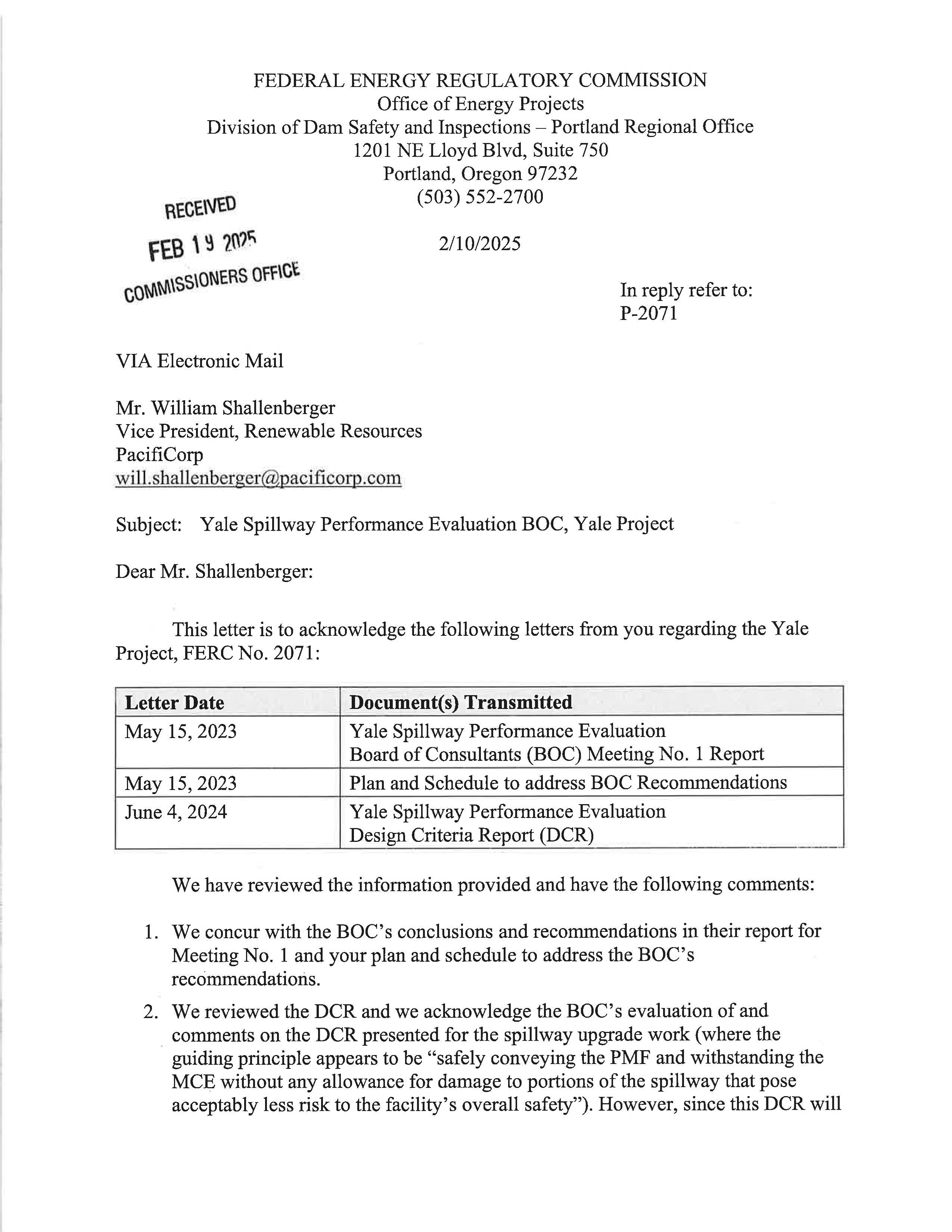 c. Federal Energy Regulatory Commission (FERC) Notice dated 2/10/25 regarding Yale Spillway Performance Evaluation BOC, Yale Project. (14038)