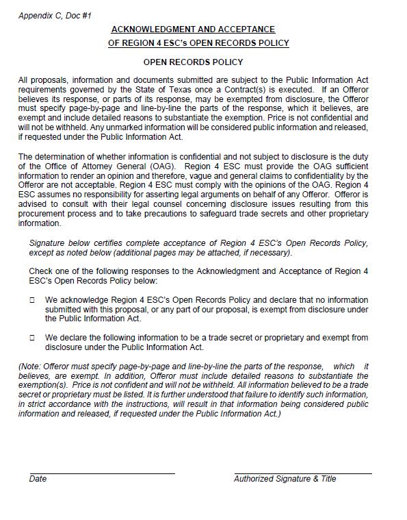 Document #1: Acknowledgment and Acceptance of Region 4 ESC’s Open Records Policy