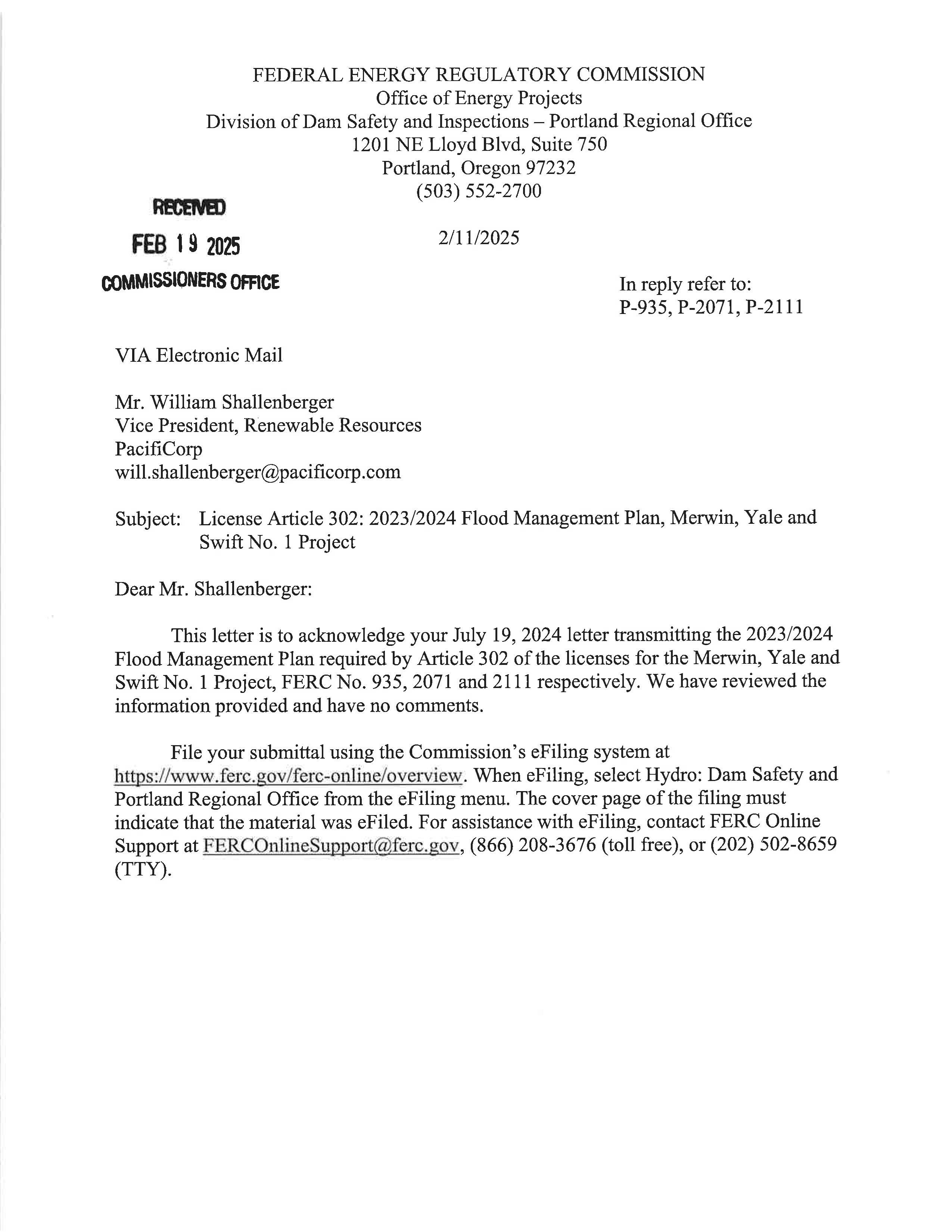 b. Federal Energy Regulatory Commission (FERC) Notice dated 2/11/2025 regarding the License Article 302: 2023-2024 Flood Management Plan, Merwin, Yale and Swift No. 1 Project. (14037)