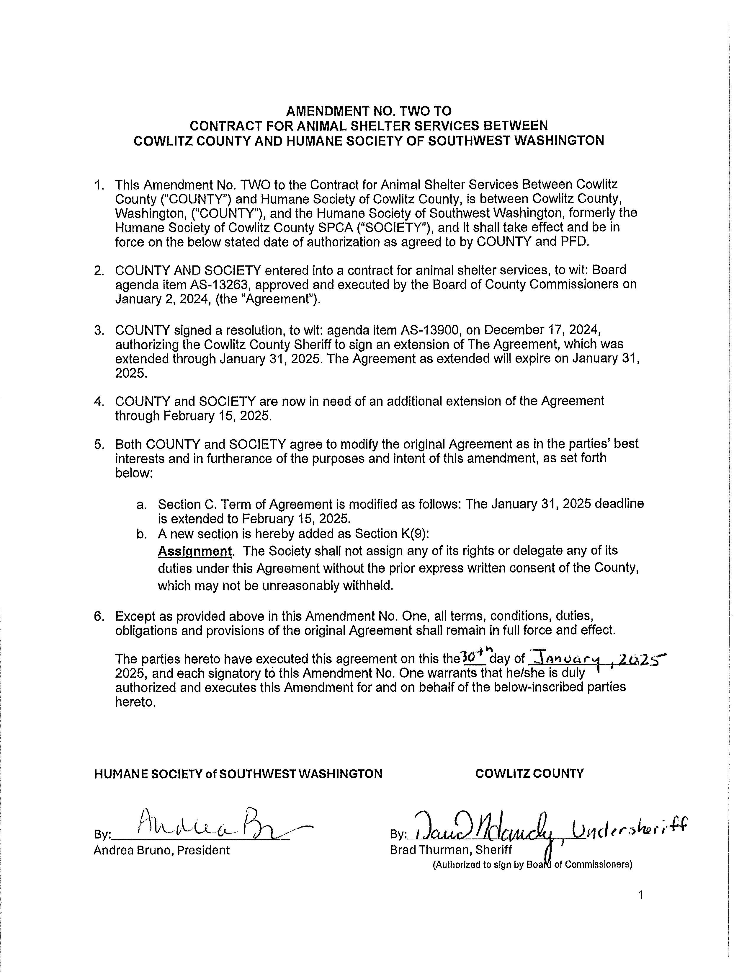 a. Signed Amendment #2 to the Contract for Animal Shelter Services with the Humane Society of Southwest Washington to extend the agreement from February 1 to February 15, 2025. (14032)