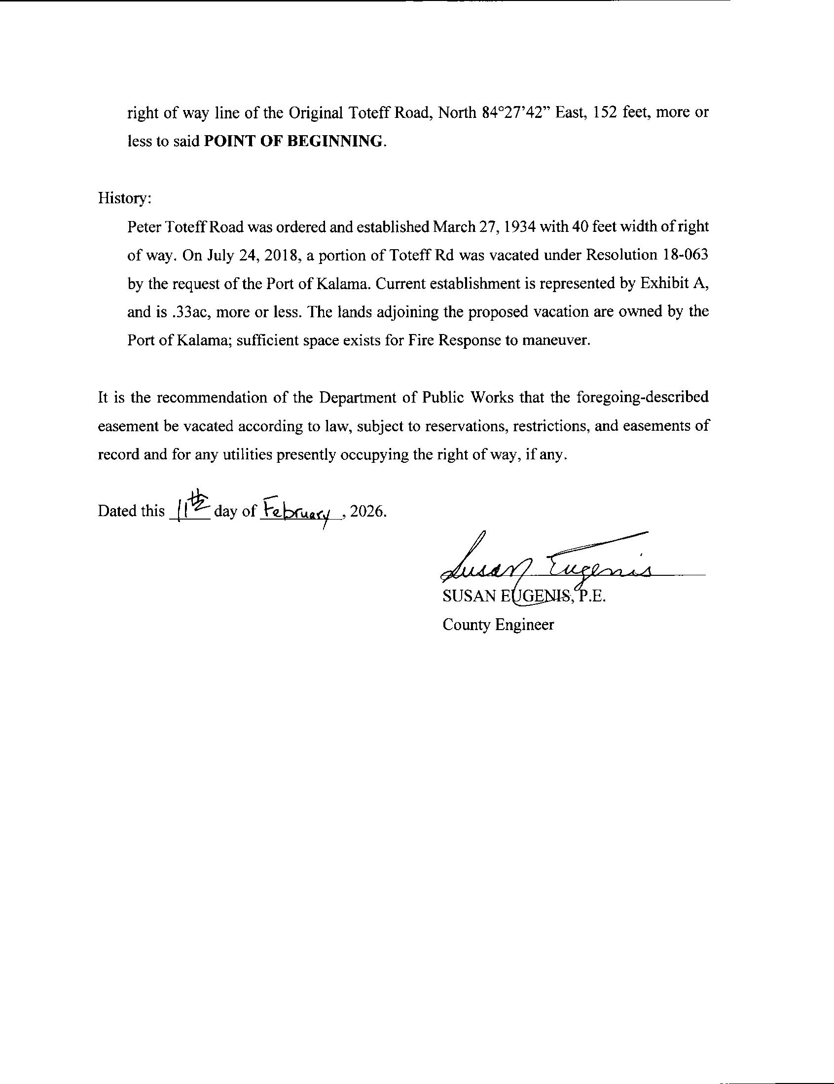 WHEREAS, the said Board of County Commissioners, in accordance with the aforementioned statutes, code and policy, proceeded to consider the report of the said County Engineer and all evidence relative to the vacation of a portion of Toteff Road and upon the Board being fully advised in the premises finds that all statutory, code and policy provisions have been addressed and that the public will benefit by said vacation, and therefore the said hereinbefore described portion of right of way should be vacated, subject to reservations, restrictions and easements of record and for existing utilities presently occupying said right of way, if any.