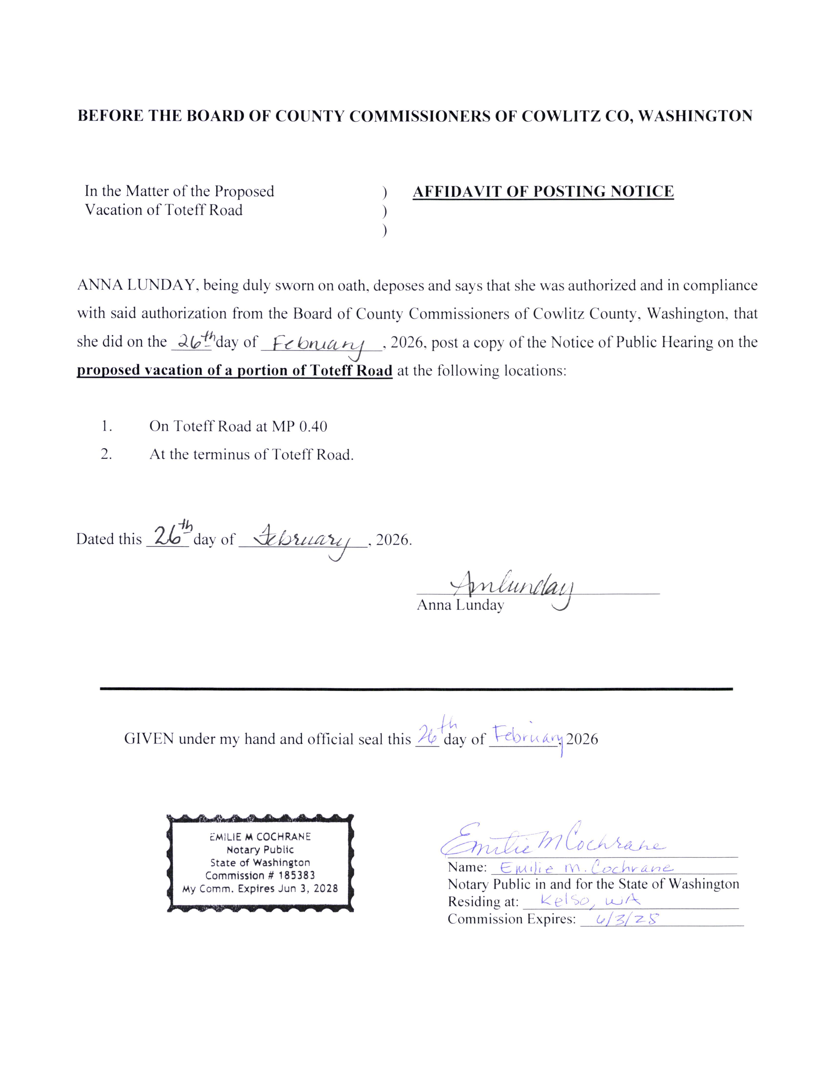 The Board of County Commissioners of Cowlitz County, Washington will receive sealed bids until April 13, 2026, prior to 1:30 p.m., for the following work: 2026 COUNTYWIDE PAVEMENT OVERLAY PROJECT.