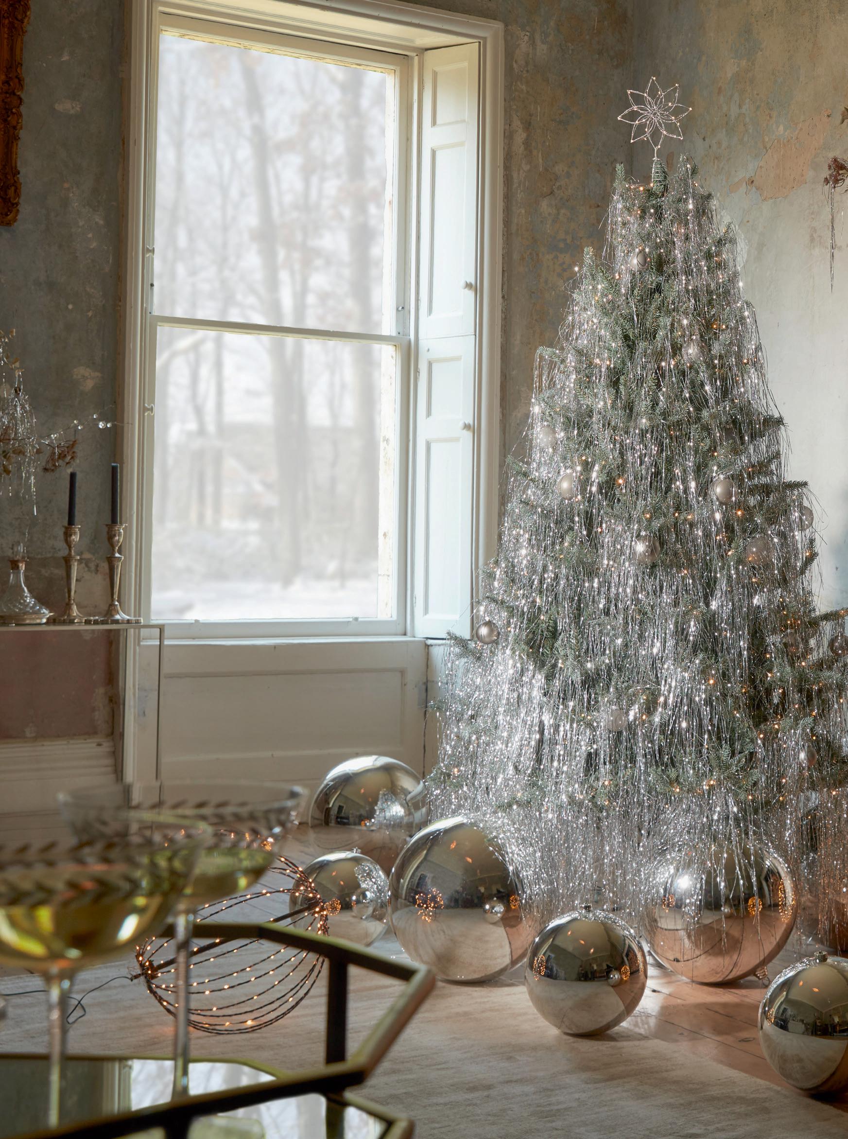 With trees and garlands ladened with pearly-toned treasures this look captures the glamour of an extravagant, low-lit house decorated for the season.