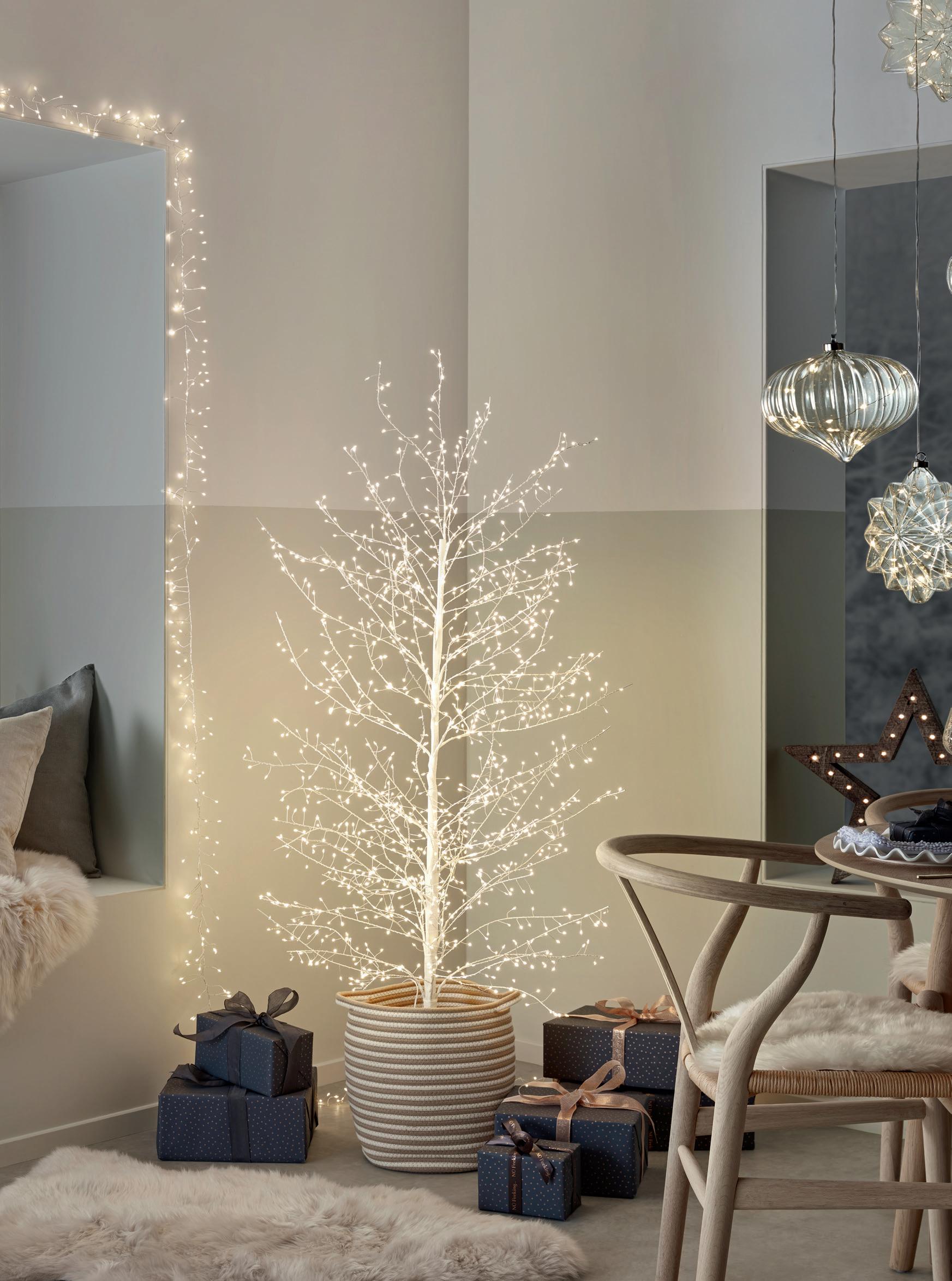1. The Ultimate Light Up Naked Wire Tree – Small £225 1035106 Large £275 1035407 2. Three White & Natural Striped Baskets £85 1735587 3. Indoor Outdoor Naked Wire Twinkle Cluster Lights £50 1027828 4. Oversized Light Up Glass Drop £22 1035082 5. Oversized Light Up Glass Snowflake £20 1035250 6. Copper Miniature Stars Wrapping Paper – 10m £14.50 1035366 7. Voile Wired Ribbon – Charcoal £16.50 1020437 8. Metallic Wired Ribbon – Copper £10.50 1035406 9. Light Up Brush Trees Centrepiece £38 1035110 10. Three Wooden Hanging Stars – Scandi Mix £22 1035103 11. No Peeking Ribbon – Charcoal £12.50 1035405