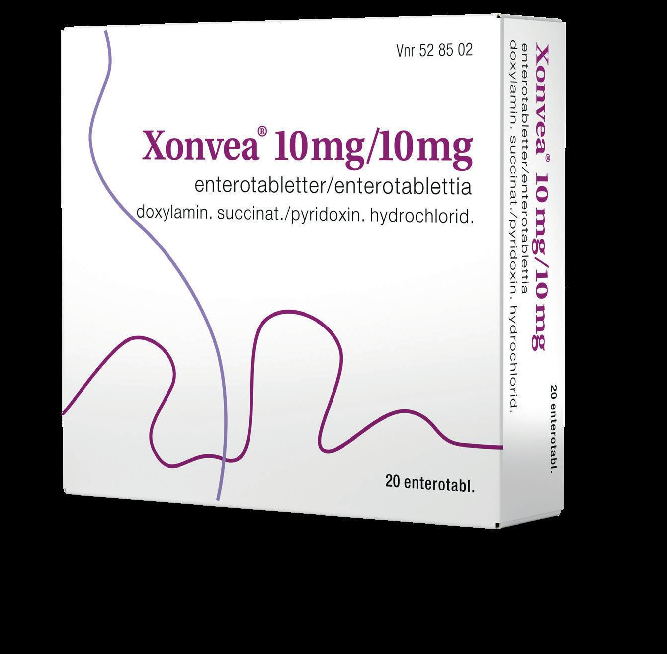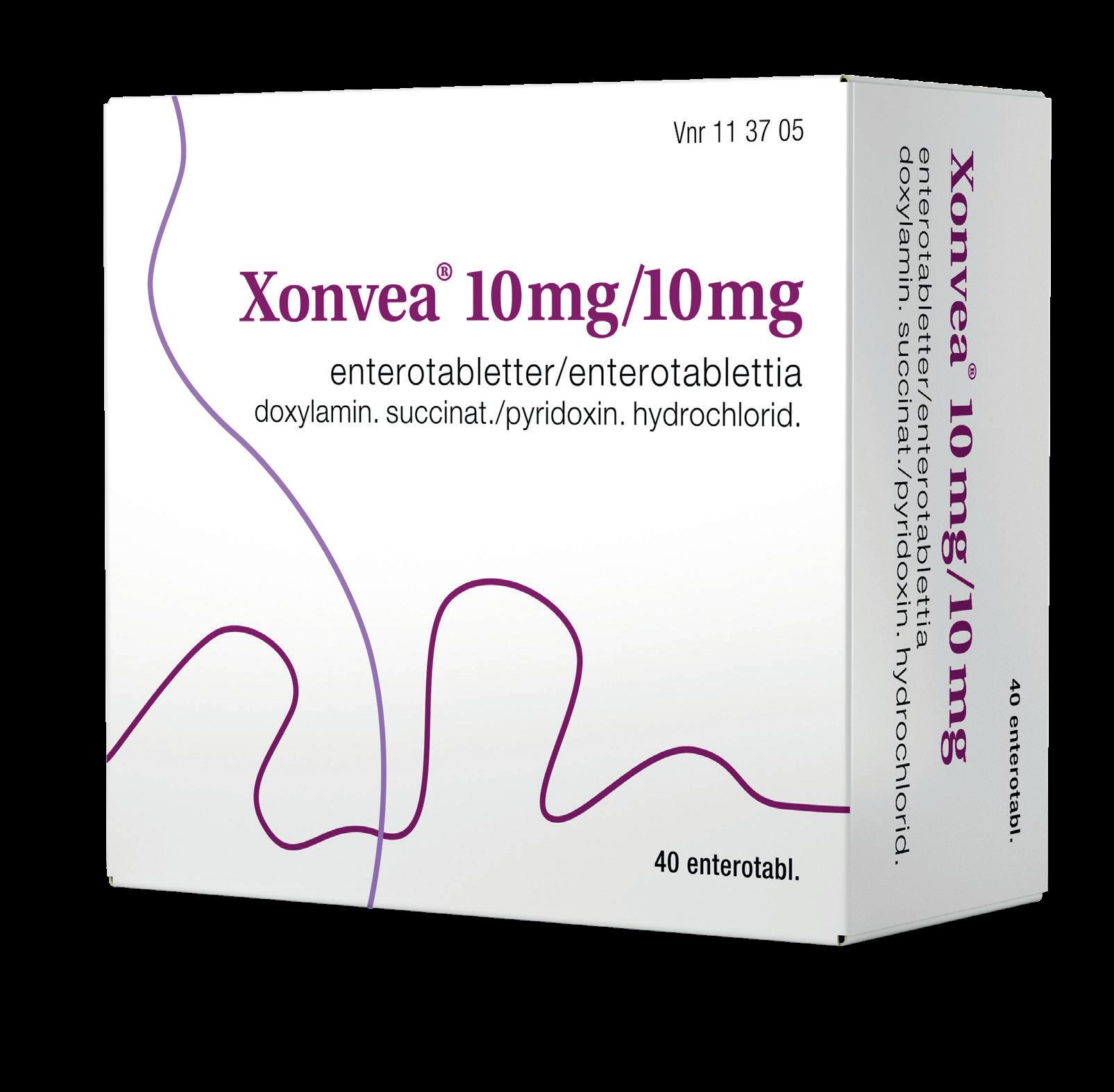 Xonvea (doksylamin og pyridoksin), enterotablett 10 mg/10 mg. Indikasjoner: For behandling av svangerskapskvalme og -oppkast (NVP) hos gravide kvinner ≥18 år som ikke responderer på konservativ behandling (dvs. livsstil- og kostholdsendringer). Dosering: Den anbefalte startdosen er to tabletter ved leggetid (dag 1). Hvis symptomene vedvarer til ettermiddagen på dag 2, bør pasienten fortsette med den vanlige dosen på to tabletter ved leggetid (dag 2), og på dag 3 ta tre tabletter (en tablett om morgenen og to tabletter ved leggetid). Hvis disse tre tablettene ikke gir tilstrekkelig symptomkontroll på dag 3, kan pasienten ta fire tabletter fra dag 4 (en tablett om morgenen, en tablett midt på dagen og to tabletter ved leggetid). Den maksimale anbefalte daglige dosen er fire tabletter (en om morgenen, en midt på dagen og to ved leggetid). Skal tas som en daglig forskrivning, og ikke etter behov. For å forebygge at svangerskapskvalme og -oppkast plutselig kommer tilbake, anbefales en gradvis nedtrappingsdose ved seponeringstidspunktet. Administrasjonsmåte: Administreres på tom mage med et glass vann. Svelges hele og skal ikke knuses, deles eller tygges. Pakninger og priser: 10 mg/10 mg: 20 st Maksimal AUP 299,50 kr, 40 st Maksimal AUP 485,00 kr. Reseptgruppe C. Viktig sikkerhetsinformasjon: Kontraindikasjoner: Overfølsomhet overfor doksylaminsuksinat, andre etanolaminderivative antihistaminer, pyridoksinhydroklorid. Samtidig bruk med monoaminoksidasehemmere (MAO-hemmere). Advarsler og forsiktighetsregler: Kan forårsake somnolens. Anbefales ikke ved samtidig bruk av legemidler som hemmer sentralnervesystemet, inkludert alkohol, hypnotiske sedativer og beroligende midler. Brukes med forsiktighet hos pasienter med astma, økt intraokulært trykk, trangvinkelglaukom, magesår med stenose, pyloroduodenal obstruksjon og blærehalsobstruksjon. Inneholder pyridoksinhydroklorid og derfor skal ytterligere nivåer fra kosten og vitamin B6-tilskudd vurderes. Inneholder azo-fargestoffet allurarød AC aluminiumslakk (E129) som kan gi allergiske reaksjoner. Inneholder benzosyre (E 210). Pasienter med hyperemesis gravidarum skal behandles av spesialist. Det har vært rapportert falske positive urinscreeingstester for metadon, opiater og fensyklidinfosfat ved bruk av doksylaminsuksinat/pyridoksinhydroklorid. Graviditet og amming: Brukes av gravide kvinner. Amming: Anbefales ikke under amming. Påvirkning av evnen til å kjøre bil og bruke maskiner: Xonvea har moderat til stor påvirkning på evnen til å kjøre bil og bruke maskiner. Aktiviteter som krever fullstendig mental oppvakthet, som å kjøre eller bruke maskiner, bør unngås til helsepersonell sier at de kan gjøre det. Bivirkninger: Hyppigst rapporterte var somnolens. Alvorlig døsighet kan oppstå ved samtidig bruk av CNS-hemmende midler, inkludert alkohol. Antikolinerge effekter av Xonvea kan forlenges og forsterkes av monoaminoksidasehemmere. Mulige klasserelaterte bivirkninger av antihistaminer, inkluderer: tørr munn, nese og hals, dysuri, urinretensjon, vertigo, synsforstyrrelser, uklart syn, diplopi, tinnitus, akutt labyrintitt, insomni, tremor, nervøsitet, irritabilitet og facial dyskinesi. Tetthet i brystet, fortykkede bronkiesekresjoner, hvesing, tett nese, svette, frysninger, tidlig menstruasjon, toksisk psykose, hodepine, svakhet og parestesi har forekommet. I sjeldne tilfeller er agranulocytose, hemolytisk anemi, leukopeni, trombocytopeni og pancytopeni, økt appetitt og/eller vektøkning rapportert. For mer informasjon om dosering, forsiktighetsregler, interaksjoner og bivirkninger se SPC 17.06.2024. 1. Produktomtale Xonvea. www.felleskatalogen.no