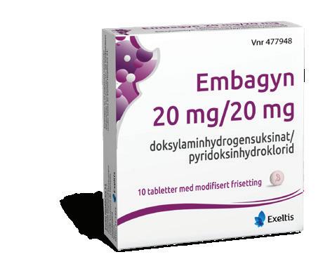 Indikasjon: Indisert for symptomatisk behandling av svangerskapskvalme og -oppkast hos gravide kvinner ≥18 år som ikke responderer på konservativ behandling (f.eks. livsstils- og kostholdsendringer). Bruksbegrensninger: Kombinasjonen doksylamin/pyridoksin har ikke blitt undersøkt ved tilfeller av hyperemesis gravidarum som skal behandles av spesialist. Dosering: Anbefalt startdose er 1 tablett ved leggetid på dag 1 og dag 2. Dersom symptomene ikke er tilstrekkelig kontrollert på dag 2, kan dosen økes på dag 3 til 1 tablett om morgenen og 1 tablett ved leggetid (totalt 2 tabletter per dag). Maksimal anbefalt dose er 2 tabletter daglig. Pakninger og priser (AUP): 10 stk.: kr 291.30. 20 stk.: kr 482,50 Reseptgruppe: C. Referanser: 1) Embagyn SPC 29.01.2025.