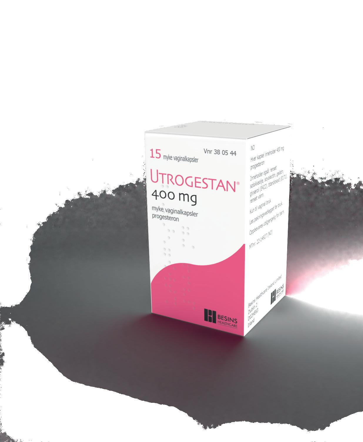 Bivirkninger: Kløe, vaginal blødning og utflod kan forekomme. For mer informasjon om dosering, kontraindikasjoner, forsiktighetsregler og bivirkninger, se Utrogestan SPC 400 mg, 01.11.2023.