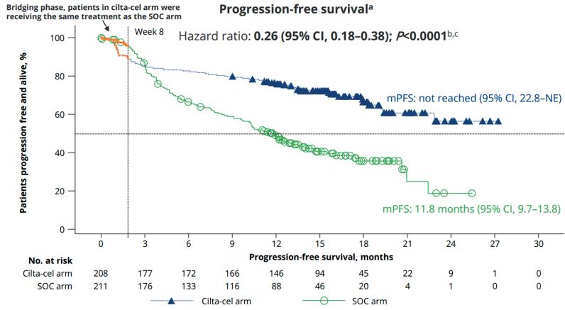 På EHA fikk vi presentert data fra CARTITUDE-4 studien. Inkluderte pasienter var refraktære for lenalidomid, og kunne ha mottatt 1 til 3 tidligere linjer. Pasientene ble randomisert 1:1 mellom standardbehandling og Cilta-Cel. Standardardbehandlingen besto av enten Daratumumab-Pomalidomid-Deksametason (DPd) eller Pomalidomid-Velcade-Deksametason (PVd). En innvending mot studien er at Daratumumab-Carfilzomib-Deksametason (DKd) ikke var en del av denne standardbehandlingen, da DKd trolig er mer effektiv enn DPd og PVd. Pasientene som ble randomisert til CAR-T fikk først «bridging» med minst en syklus standardbehandling, og