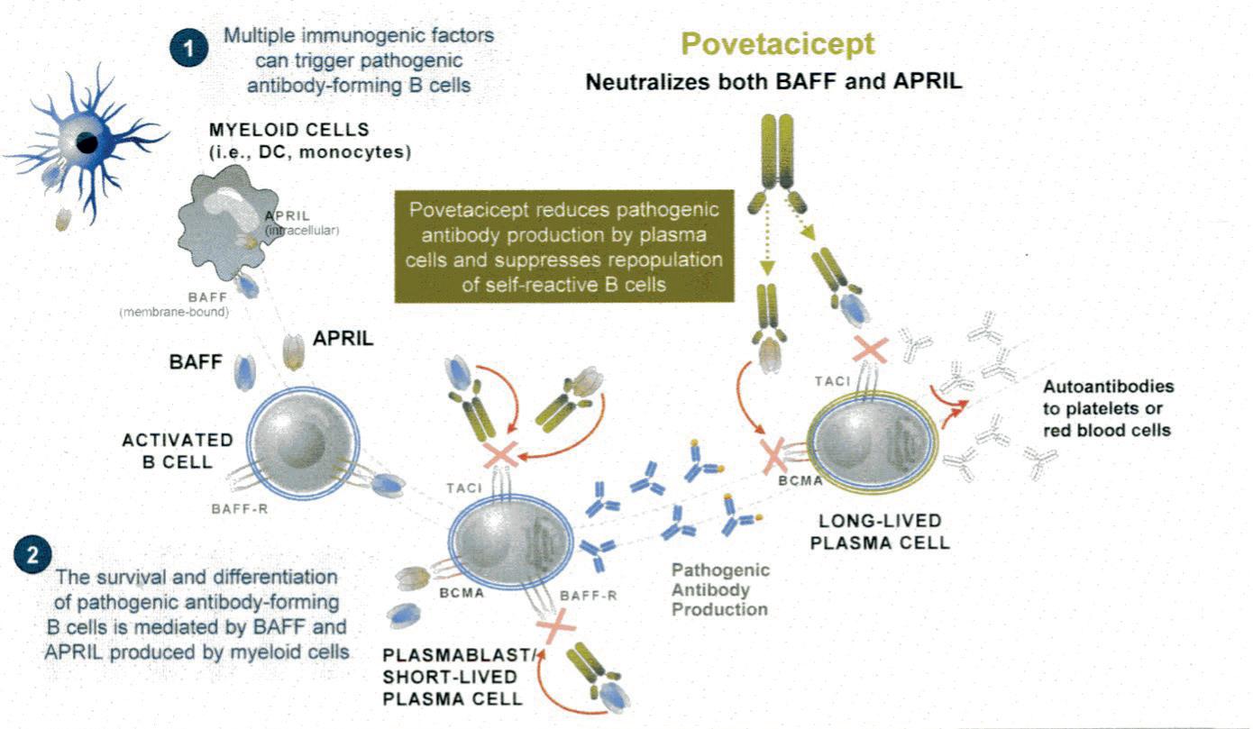 Povetacicept (ALPN-303): Nytt medikament «entering the pipeline» En oral presentasjon ved Stacey Dillon (Seattle, USA) hadde tittelen «Povetacicept (ALPN-303), a dual BAFF/APRIL antagonist, for the treatment of autoimmune cytopenias and other antibody-related diseases.” Dette monoklonale antistoffet blokkerer cytokinene APRIL og BAFF, som begge dannes av myeloide celler og stimulerer B-lymfocytter og plasmaceller. Ved å blokkere begge disse