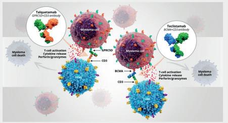 Figur 2: Bispesifikke antistoffer gjør at myelomatosecellene og T-cellene kommer nærme hverandre, slik at T-cellen kan drepe myelomatosecellene. Både Teclistamab og Talquetamab binder CD3 på T-cellene, og henholdsvis GPRC5D og BCMA på myelomatosecellene.