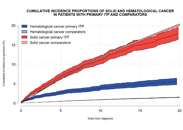 Mannering og medarbaidere presenterte register- basert studie som evaluerte risiko for utvikling av kreft i voksen ITP populasjon. Data for 4768 pasienter med primær ITP og 189662 kontroller ble analysert. Risikoen var økt for både solide og hematologiske maligniteter. Denne risikoen var betraktelig høyere for utvikling av hematologisk kreft (leukemi/ lymfom), ila første året fra ITP diagnosen (1 års kumulativ insidens for hematologisk kreft på 0.94% (0.69-1.26) vs 0.08% (0.07-0.09) i kontoll gruppe). Noe av funnene kan kanskje forklares med at en del pasienter som ble klassifisert som primær ITP, kunne i realiteten hatt underliggende malign hematologisk lidelse med immun trombocytopeni som første presentasjon.