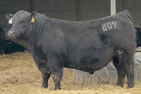 809 was our pick from the 2019 McCumber Sale. He is a balanced bull, clean fronted and long made and really stamps those qualities into his progeny. A calving ease option with some go, 809 has worked well on heifers and cows. He is an outlier in that he is a big ribeye bull having posted an actual yearling REA of 17.60 to ratio 131 while earning a 107 IMF ratio. The story on his dam reads well too, having never missed an A. I. service on 11 calves, posting a NR of 103. His young daughters are wedge shaped and really drop a pretty udder.