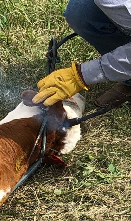 Only people that are knowledgeable and properly trained should apply brands. Brands must be registered with provincial brand inspection agencies and can be placed on the shoulder, rib, or hip. Face branding is not legal in Canada. Whenever possible, consider replacing branding and surgical alterations of cattle (such as wattling or earsplitting) with less invasive identification practices.