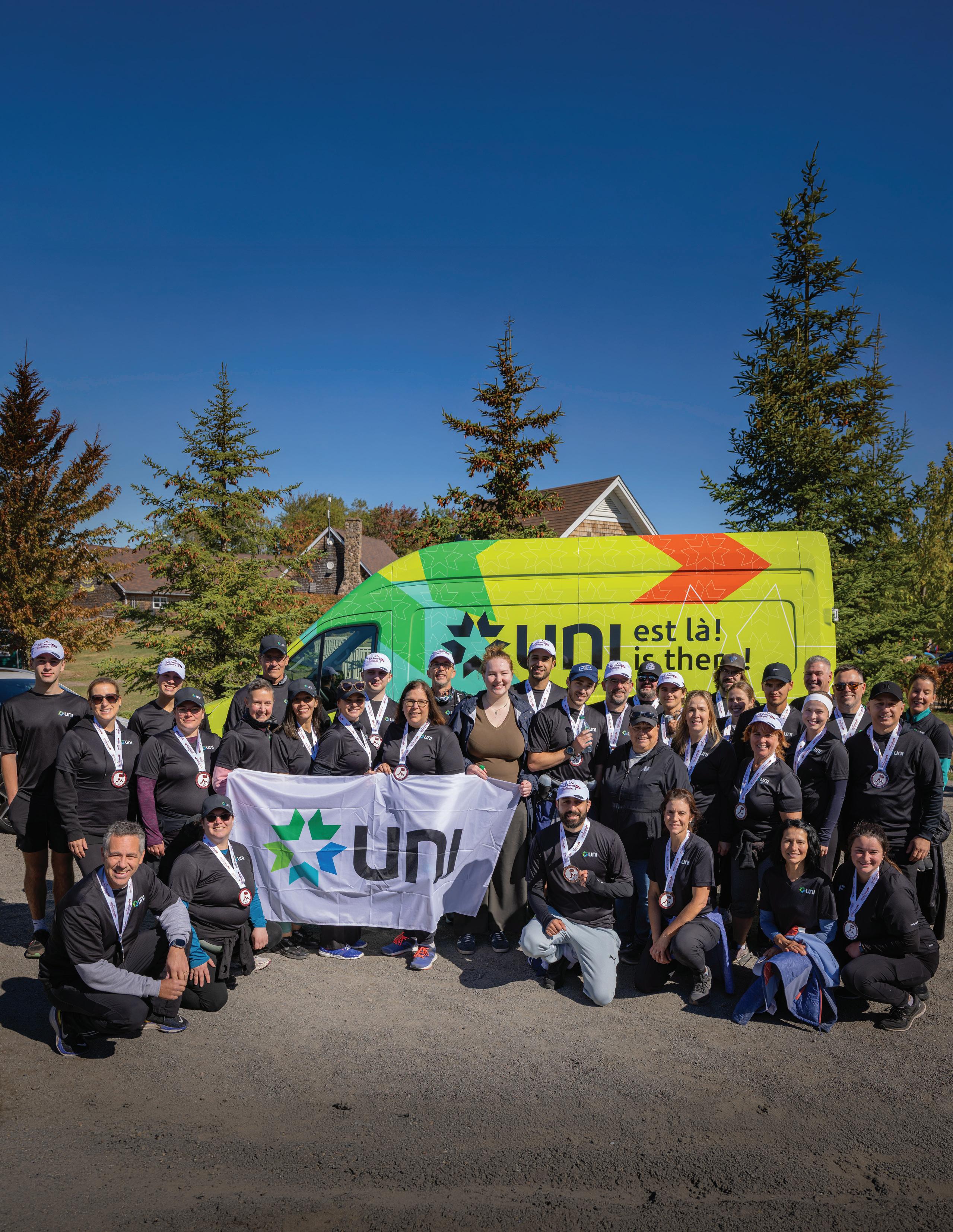 UNI et UNI Assurance ont participé en force au Défi Everest Challenge à Dieppe. Avec 74 employés en 14 équipes, nous avons franchi l’équivalent du mont Everest plus de 12 fois ! L’événement a permis d’amasser plus de 150 000 $ pour la recherche sur le myélome et P.R.O. Jeunesse, dans une ambiance énergique qui reflétait parfaitement nos valeurs de solidarité et d’engagement communautaire.