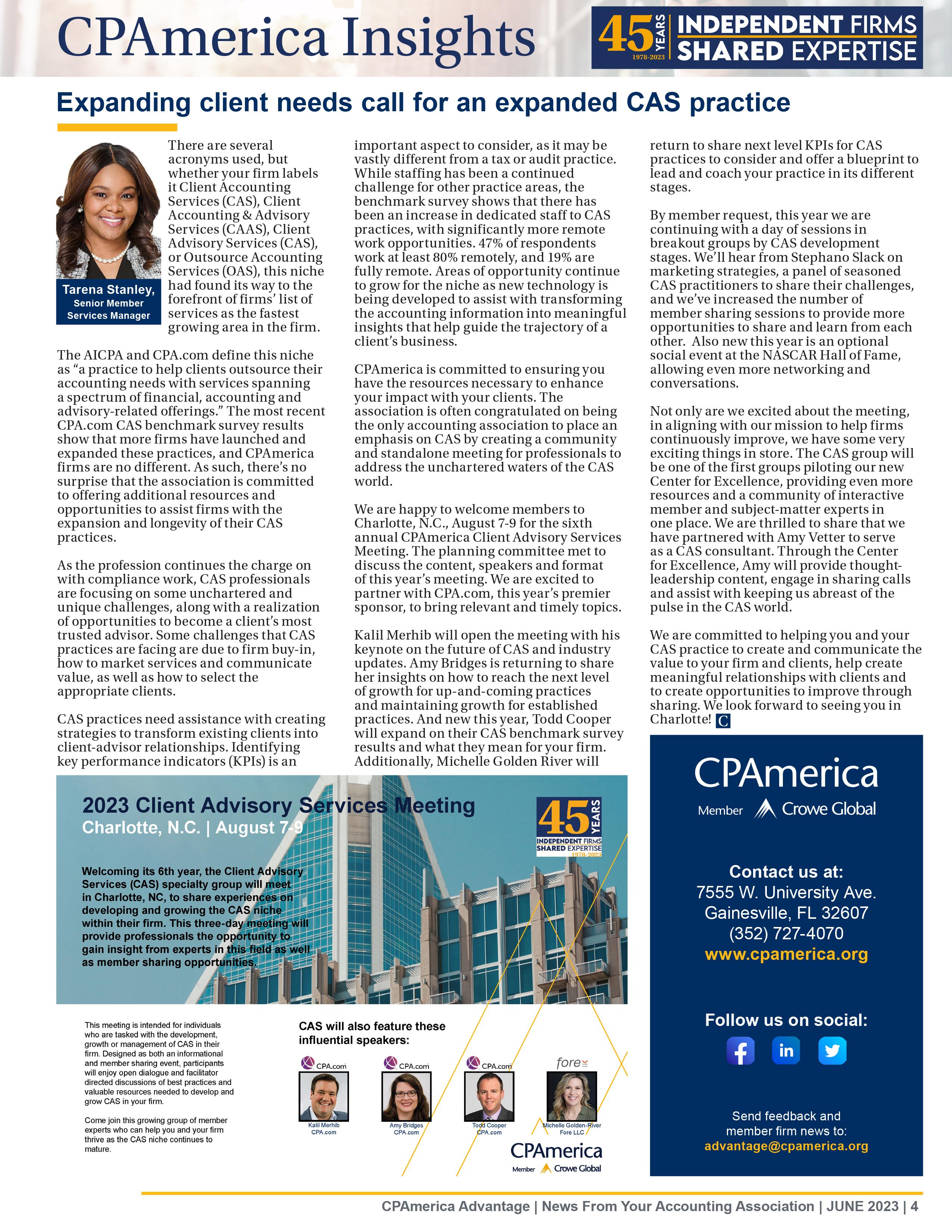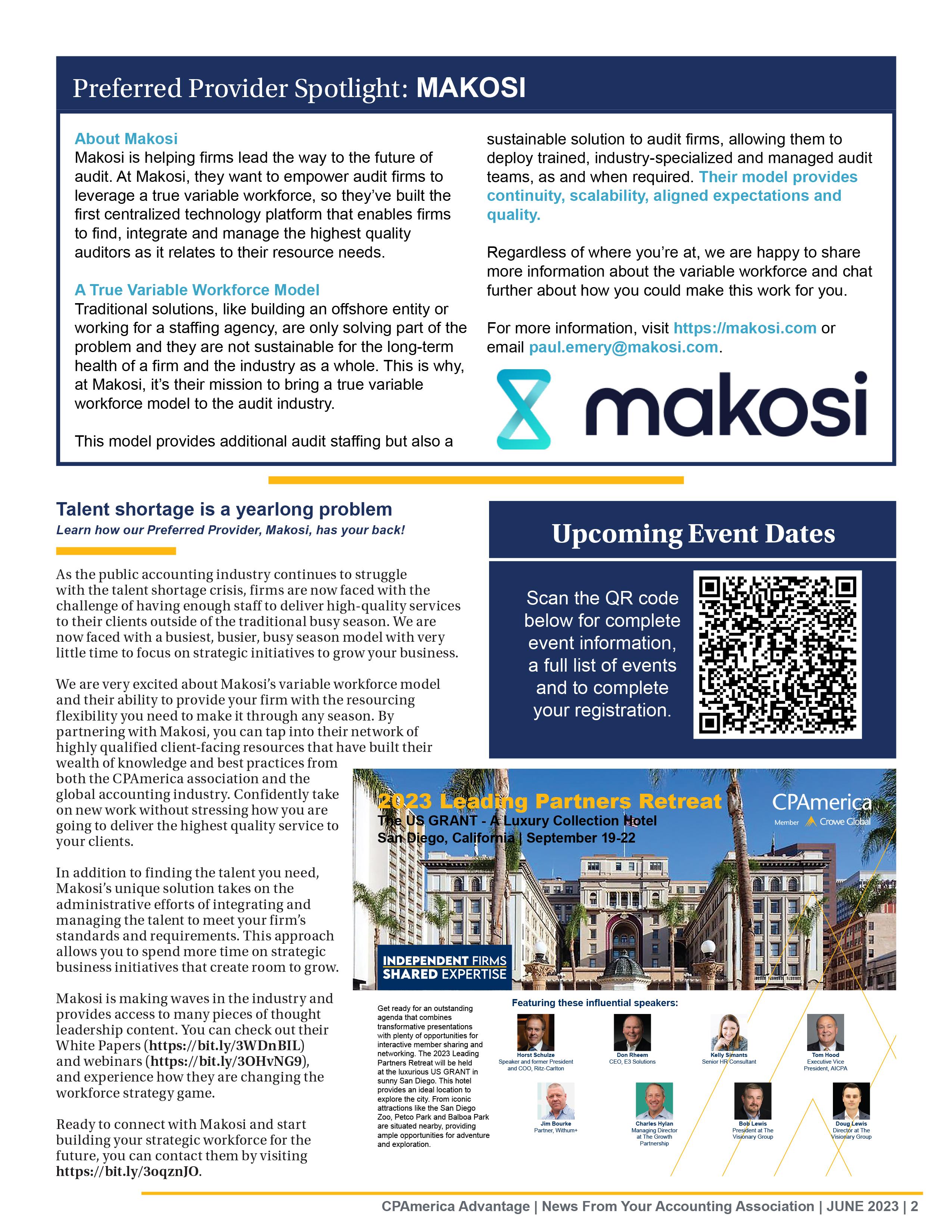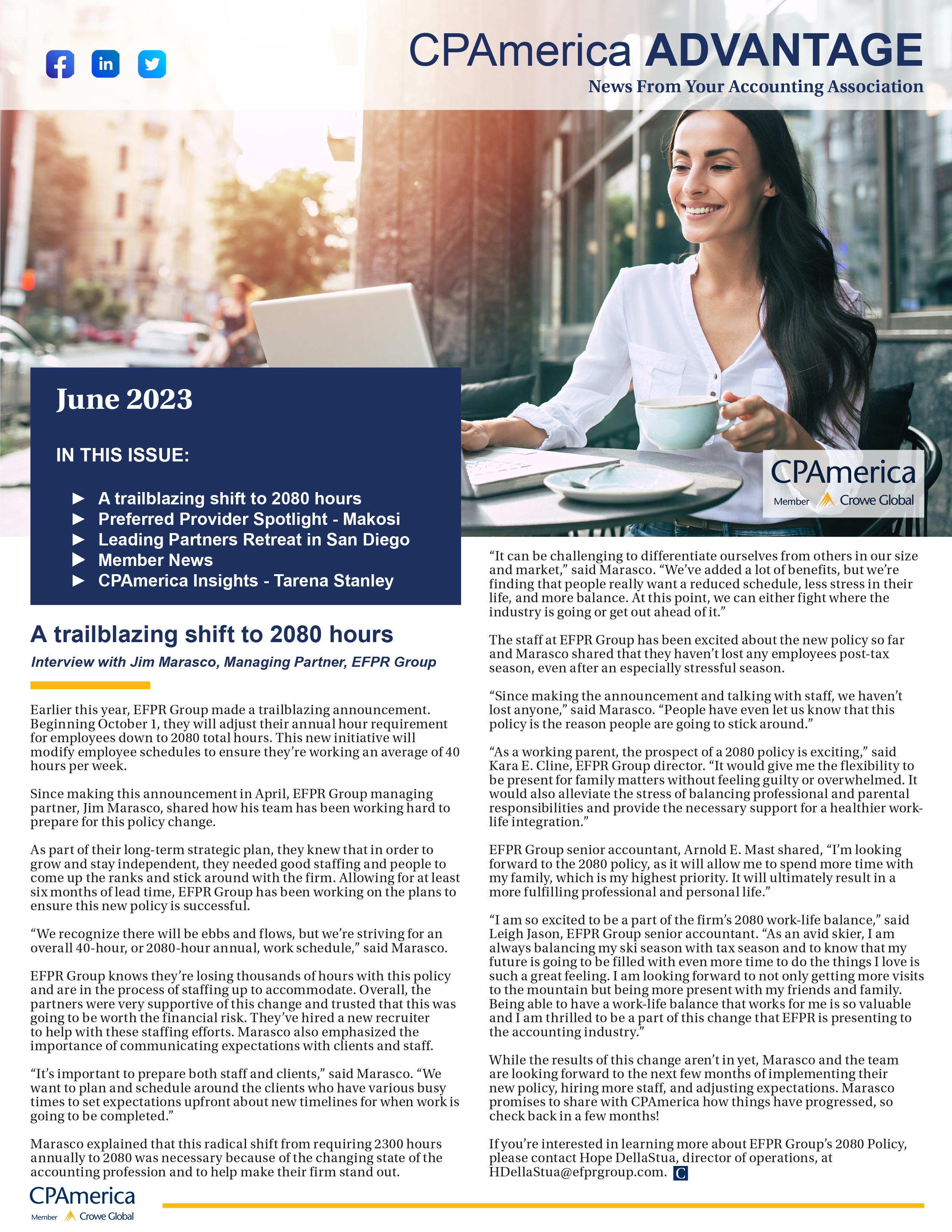 This is the June 2023 CPAmerica Advantage newsletter. Articles include: A trailblazing shift to 2080 hours with EFPR Group; Leading Partners Retreat in San Diego; CPAmerica Insights - Tarena Stanley; Member News; and a Preferred Provider spotlight: Makosi.